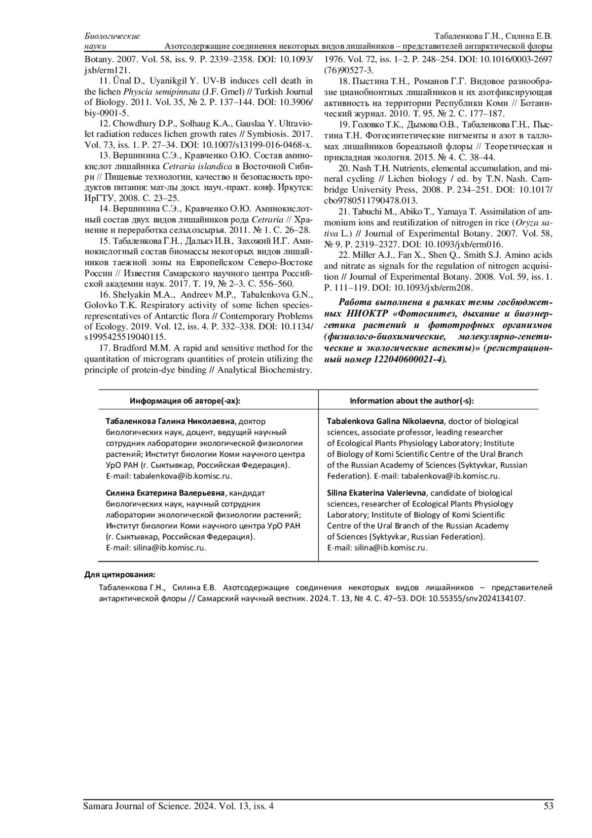 ТАБАЛЕНКОВА Г. Н., СИЛИНА Е. В. АЗОТСОДЕРЖАЩИЕ СОЕДИНЕНИЯ НЕКОТОРЫХ ВИДОВ ЛИШАЙНИКОВ - ПРЕДСТАВИТЕЛЕЙ АНТАРКТИЧЕСКОЙ ФЛОРЫ // САМАРСКИЙ НАУЧНЫЙ ВЕСТНИК. 2024. ТОМ 13, № 4