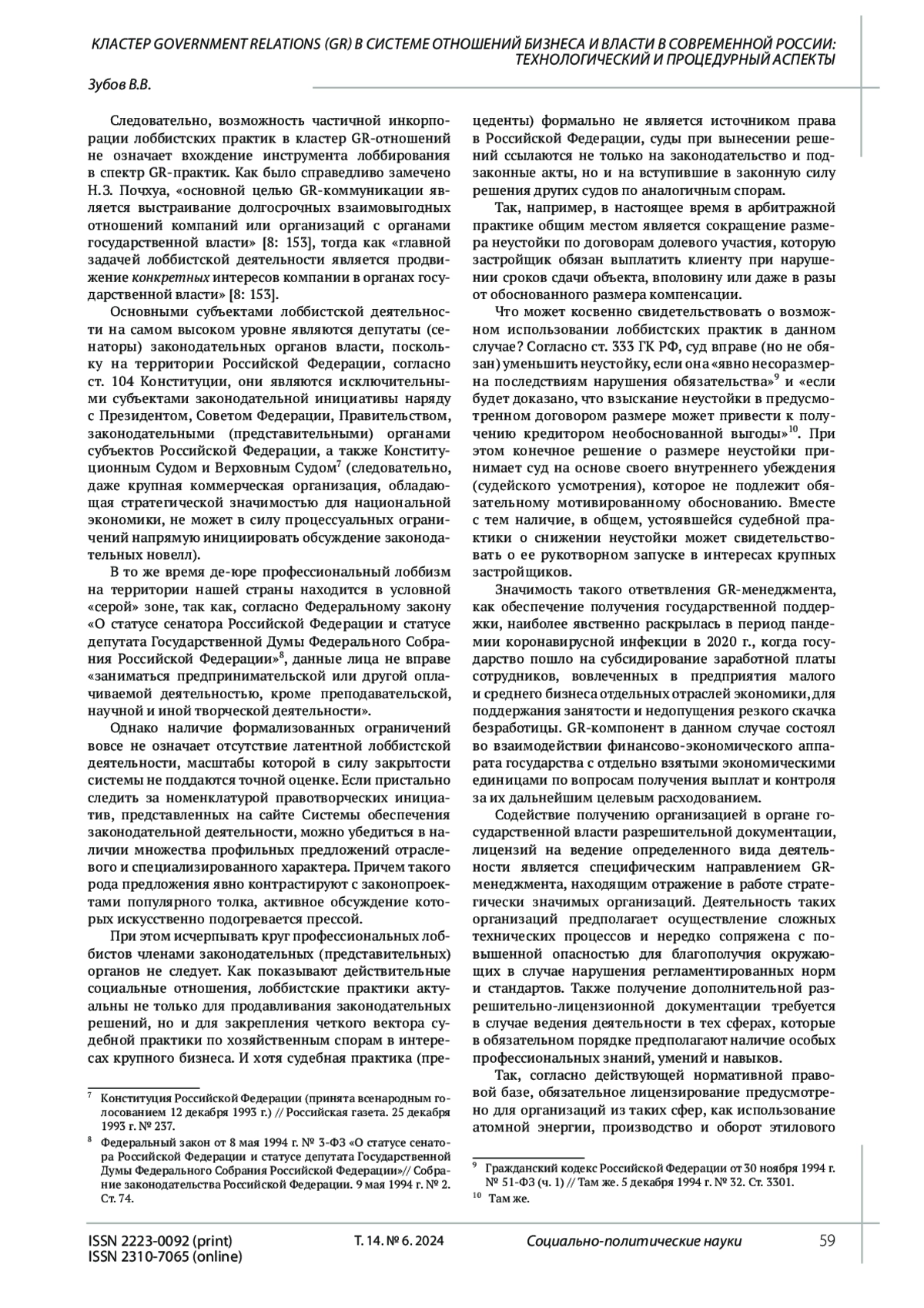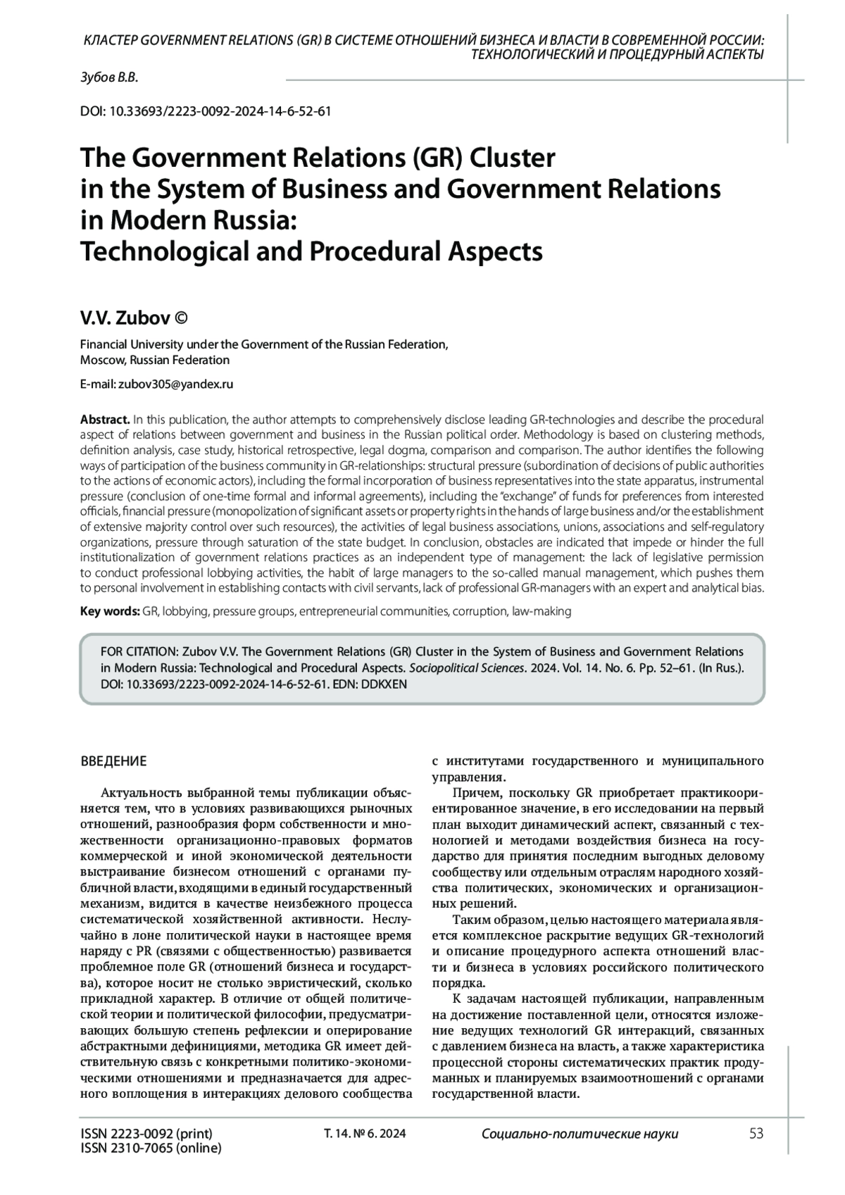 В настоящей публикации автор на основе методов кластеризации, анализа дефиниций, case study, исторической ретроспективы, юридической догматики, сравнения и сопоставления предпринимает попытку комплексного раскрытия ведущих GR-технологий и описания процедурного аспекта отношений власти и бизнеса в условиях российского политического порядка. Решая задачи, связанные с изложением ведущих технологий GR-интеракций и характеристикой процессной стороны систематических практик продуманных и планируемых взаимоотношений с органами государственной власти, автор выделяет следующие способы участия делового сообщества в GR-отношениях: структурное давление (подчинение решений публичной власти действиям экономических акторов), в том числе формальная инкорпорация представителей деловых кругов в государственный аппарат, инструментальное давление (заключение разовых формальных и неформальных договоренностей), в том числе «обмен» денежных средств на преференции со стороны заинтересованных должностных лиц, финансовое давление (монополизация значимых активов или имущественных прав в руках крупного бизнеса и/или установление обширного мажоритарного контроля за такими ресурсами), деятельность легальных предпринимательских объединений, союзов, ассоциаций и саморегулируемых организаций, давление через насыщение государственного бюджета. В заключении обозначаются препоны, которые препятствуют или тормозят полноценную институционализацию практик government relations в качестве самостоятельной разновидности менеджмента: отсутствие законодательного разрешения на ведение профессиональной лоббистской деятельности, привычка руководителей крупного звена к так называемому ручному управлению, что подталкивает их к личной вовлеченности в налаживание контактов с государственными служащими, нехватка профессиональных GR-менеджеров с экспертным и аналитическим уклоном.