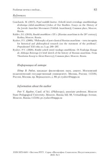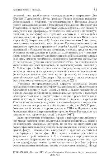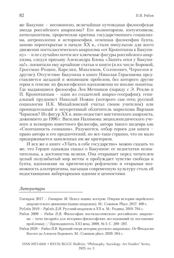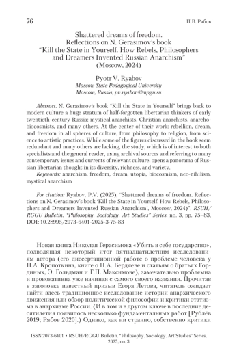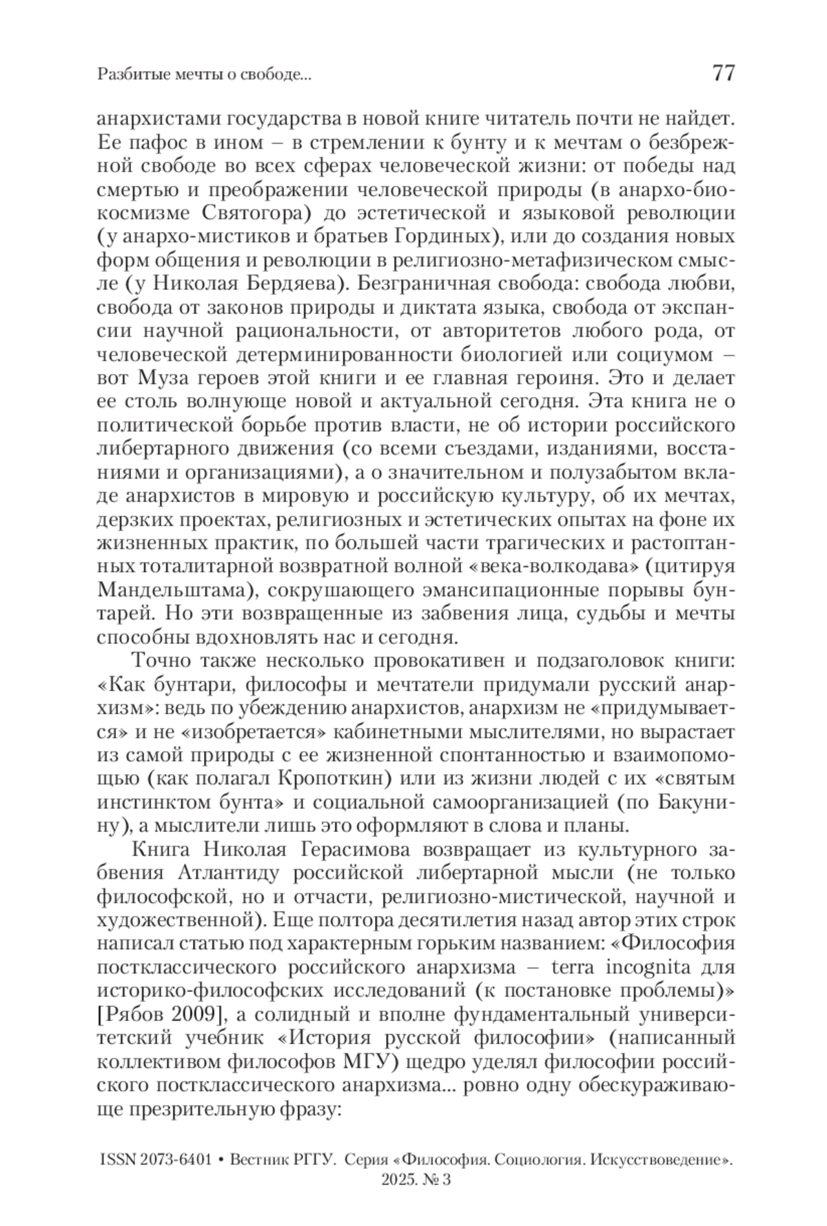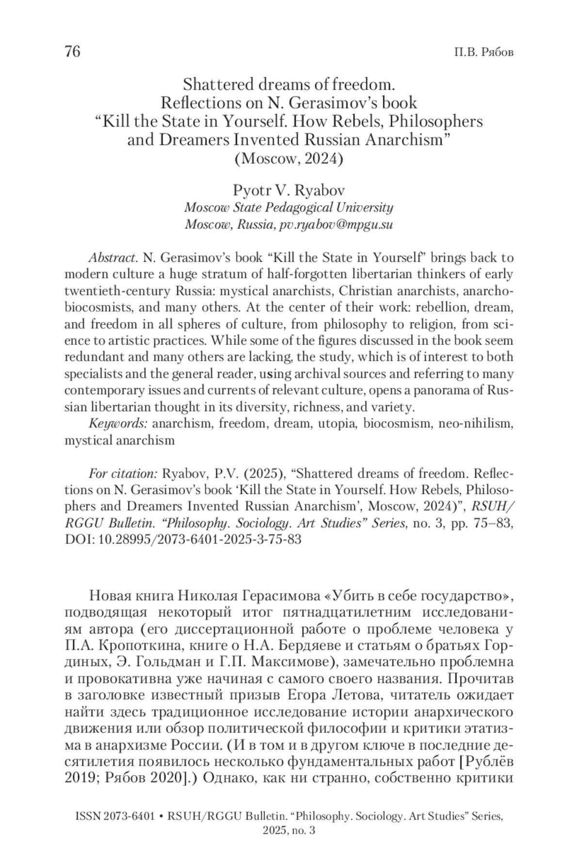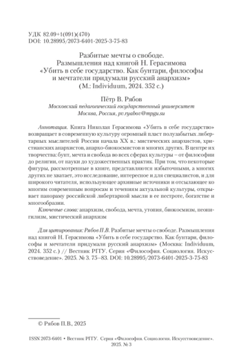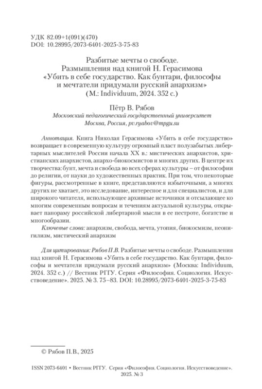 РЯБОВ П. В. РАЗБИТЫЕ МЕЧТЫ О СВОБОДЕ. РАЗМЫШЛЕНИЯ НАД КНИГОЙ Н. ГЕРАСИМОВА «УБИТЬ В СЕБЕ ГОСУДАРСТВО. КАК БУНТАРИ, ФИЛОСОФЫ И МЕЧТАТЕЛИ ПРИДУМАЛИ РУССКИЙ АНАРХИЗМ» (М.: INDIVIDUUM, 2024. 352 C.) // ВЕСТНИК РГГУ. СЕРИЯ: ФИЛОСОФИЯ. СОЦИОЛОГИЯ. ИСКУССТВОВЕДЕНИЕ. 2025. № 3
