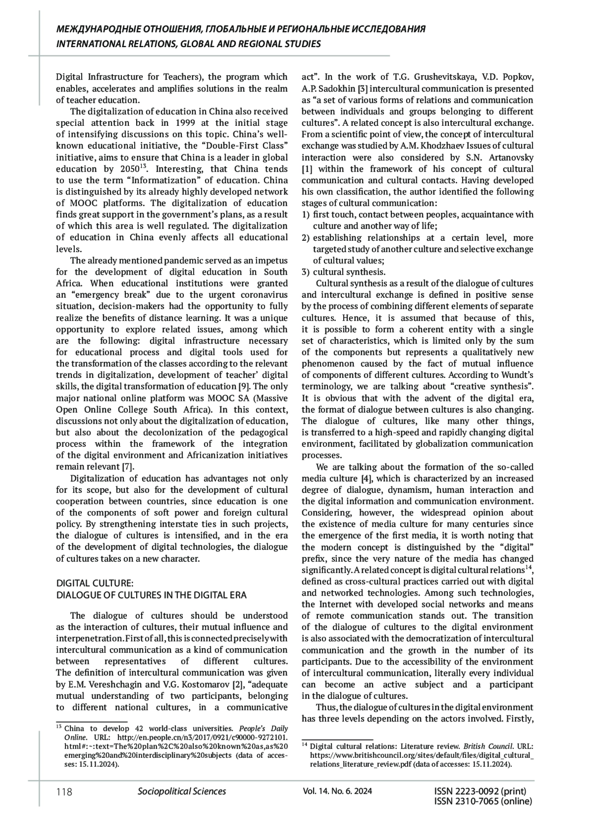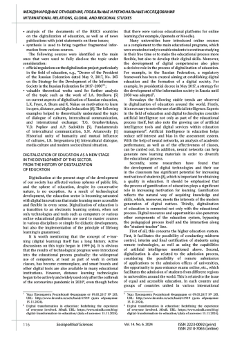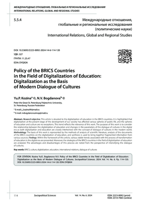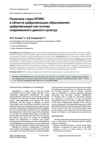 КОЗИНА Ю. П., БОГДАНОВА Н. В. ПОЛИТИКА СТРАН БРИКС В ОБЛАСТИ ЦИФРОВИЗАЦИИ ОБРАЗОВАНИЯ: ЦИФРОВИЗАЦИЯ КАК ОСНОВА СОВРЕМЕННОГО ДИАЛОГА КУЛЬТУР // СОЦИАЛЬНО-ПОЛИТИЧЕСКИЕ НАУКИ. 2024. Т. 14 № 6