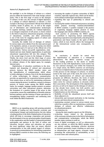 Статья: ПОЛИТИКА СТРАН БРИКС В ОБЛАСТИ ЦИФРОВИЗАЦИИ ОБРАЗОВАНИЯ: ЦИФРОВИЗАЦИЯ КАК ОСНОВА СОВРЕМЕННОГО ДИАЛОГА КУЛЬТУР (2024)