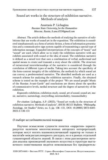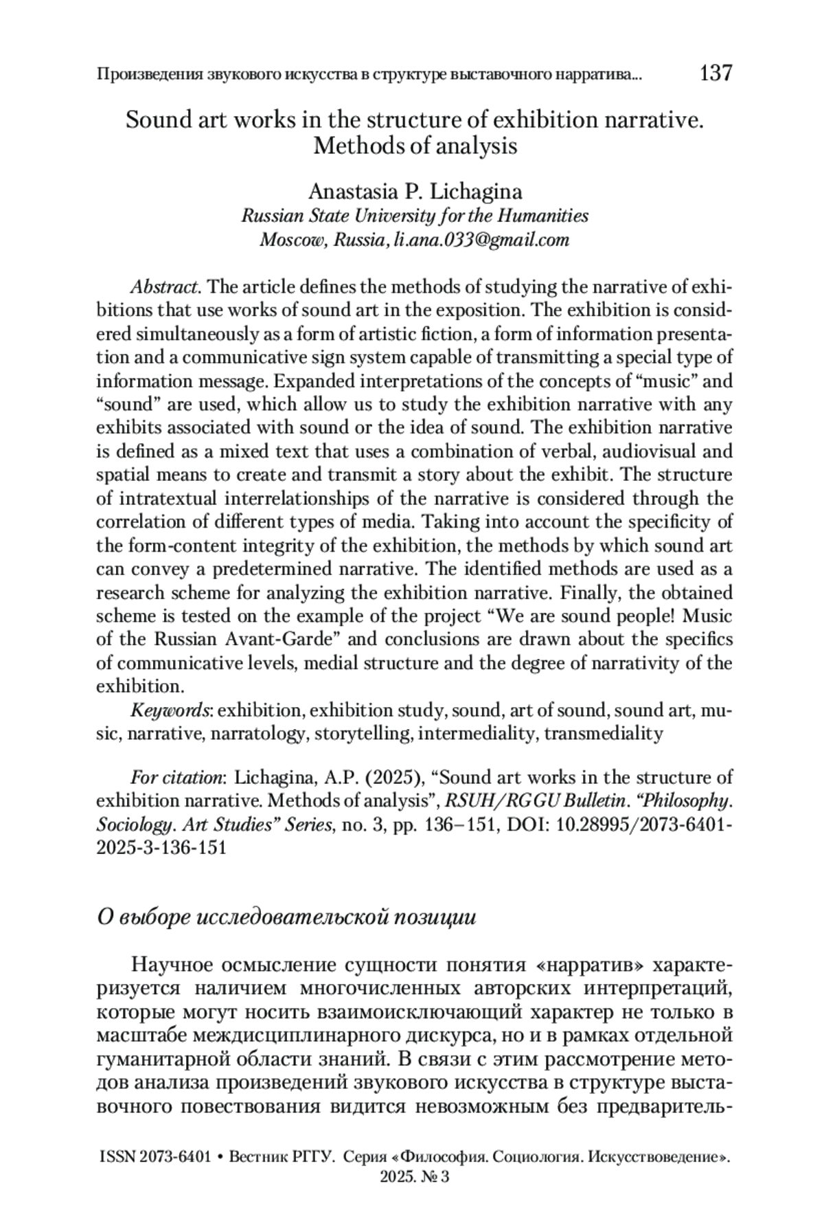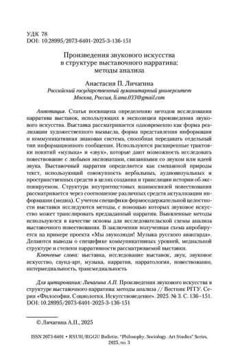 Статья посвящена определению методов исследования нарратива выставок, использующих в экспозиции произведения звукового искусства. Выставка рассматривается одновременно как форма реализации художественного вымысла, форма представления информации и коммуникативная знаковая система, способная передавать отдельный тип информационного сообщения. Используются расширенные трактовки понятий «музыка» и «звук», которые дают возможность исследовать повествование с любыми экспонатами, связанными со звуком или идеей звука. Выставочный нарратив определяется как смешанной природы текст, использующий совокупность вербальных, аудиовизуальных и пространственных средств в целях создания и трансляции истории об экспонируемом. Структура внутритекстовых взаимосвязей повествования рассматривается через соотношение различных средств актуализации информации (медиа). С учетом специфики формосодержательной целостности выставки исследуются методы, с помощью которых звуковое искусство может транслировать предзаданный нарратив. Выявленные методы используются в качестве основы для исследовательской схемы анализа выставочного повествования. В заключении полученная схема апробируется на примере проекта «Мы звуколюди! Музыка русского авангарда». Делаются выводы о специфике коммуникативных уровней, медиальной структуре и степени нарративности рассматриваемой выставки.