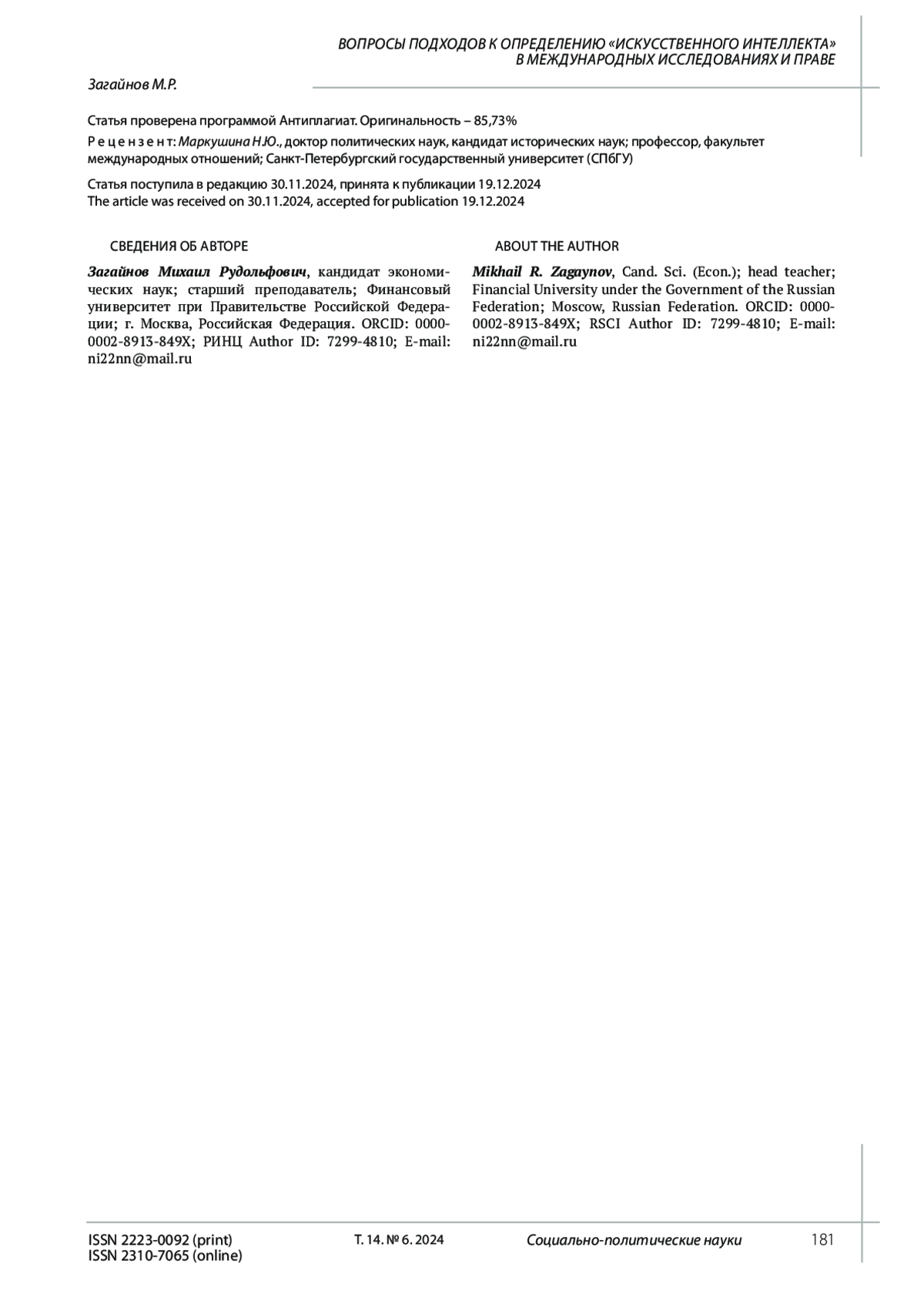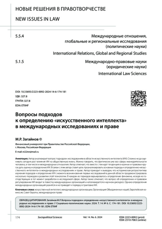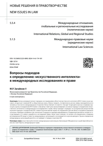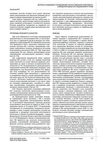ЗАГАЙНОВ М. Р. ВОПРОСЫ ПОДХОДОВ К ОПРЕДЕЛЕНИЮ "ИСКУССТВЕННОГО ИНТЕЛЛЕКТА" В МЕЖДУНАРОДНЫХ ИССЛЕДОВАНИЯХ И ПРАВЕ // СОЦИАЛЬНО-ПОЛИТИЧЕСКИЕ НАУКИ. 2024. Т. 14 № 6