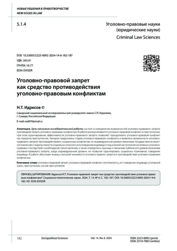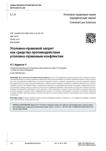 Цель написания исследовательской работы состоит в определении возможностей уголовно-правового запрета противодействовать уголовно-правовым конфликтам. В работе разграничивается уголовно-правовой конфликт и преступление, при этом гарантирование эффективности уголовно-правового запрета позволяет преодолевать уголовно-правовой конфликт как предтеча преступлению. Автором предложены стадии уголовно-правового конфликта и выявлены возможности уголовно-правового запрета противодействовать социальным конфликтам на индивидуальном уровне механизма государственно-властного веления о недопустимости социально опасного акта поведения индивида и под угрозой наступления негативных уголовно-правовых последствий несоблюдения такого веления, а также определены границы и механизм публичного уровня механизма уголовно-правового запрета, когда индивидуальный уровень не позволил гарантировать социально позитивное поведение индивида. В работе обоснован вывод о высокой значимости уголовно-правого запрета в противодействии уголовно-правовом конфликтам.