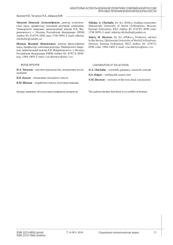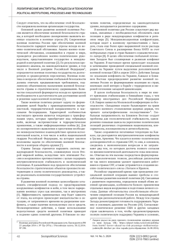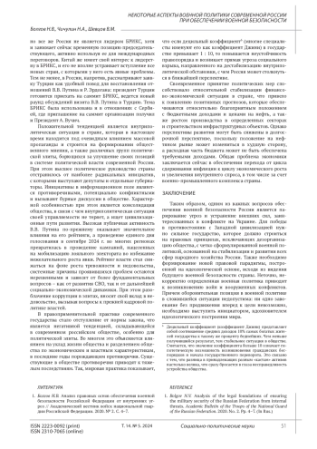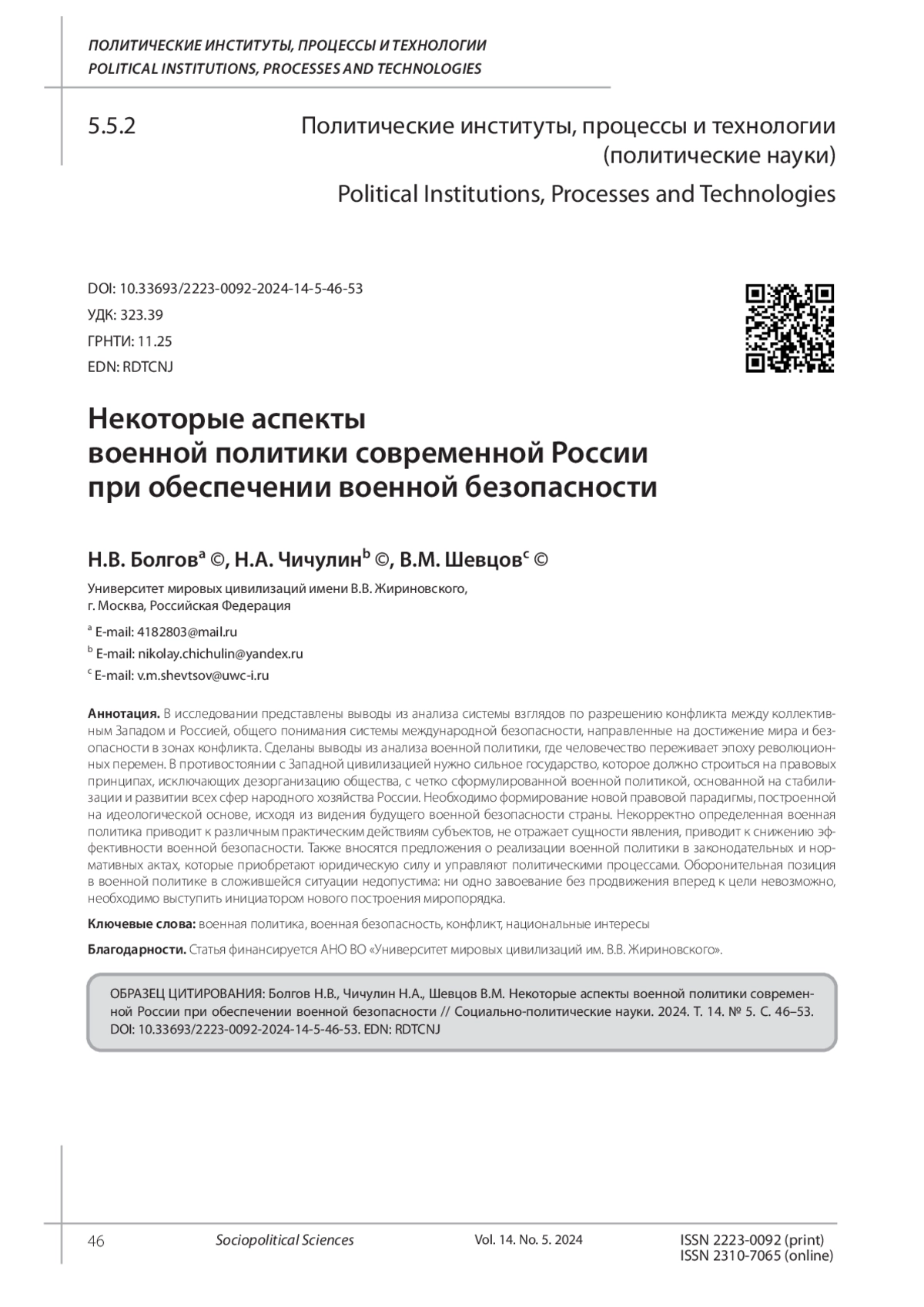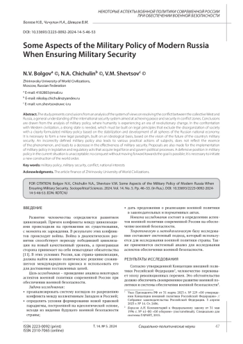 БОЛГОВ Н. В., ЧИЧУЛИН Н. А., ШЕВЦОВ В. М. НЕКОТОРЫЕ АСПЕКТЫ ВОЕННОЙ ПОЛИТИКИ СОВРЕМЕННОЙ РОССИИ ПРИ ОБЕСПЕЧЕНИИ ВОЕННОЙ БЕЗОПАСНОСТИ // СОЦИАЛЬНО-ПОЛИТИЧЕСКИЕ НАУКИ. 2024. Т. 14 № 5 (25 СТ.)