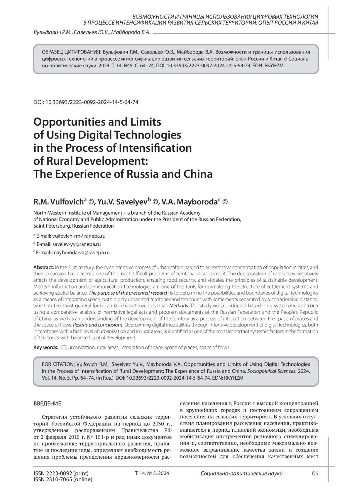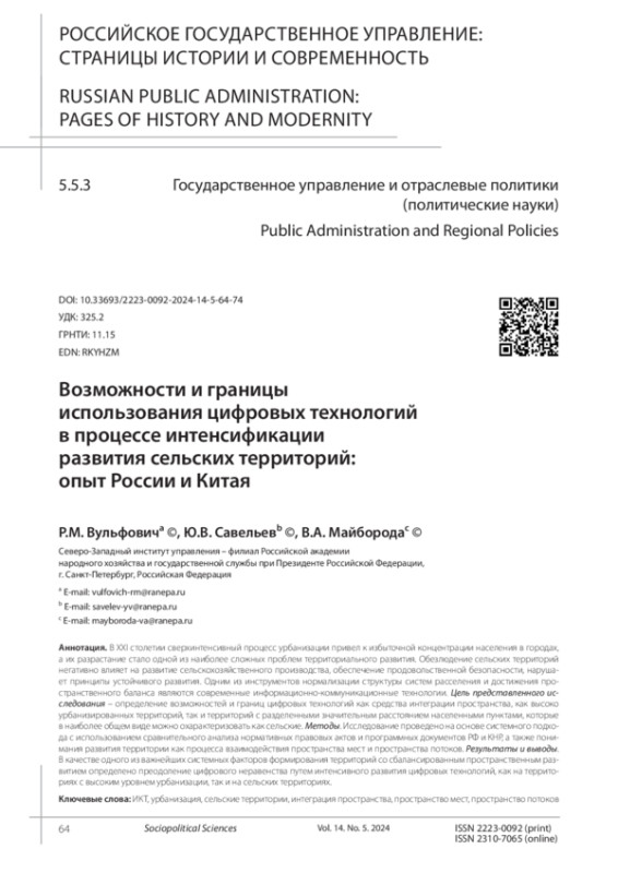 В XXI столетии сверхинтенсивный процесс урбанизации привел к избыточной концентрации населения в городах, а их разрастание стало одной из наиболее сложных проблем территориального развития. Обезлюдение сельских территорий негативно влияет на развитие сельскохозяйственного производства, обеспечение продовольственной безопасности, нарушает принципы устойчивого развития. Одним из инструментов нормализации структуры систем расселения и достижения пространственного баланса являются современные информационно-коммуникационные технологии. Цель представленного исследования - определение возможностей и границ цифровых технологий как средства интеграции пространства, как высоко урбанизированных территорий, так и территорий с разделенными значительным расстоянием населенными пунктами, которые в наиболее общем виде можно охарактеризовать как сельские. Методы. Исследование проведено на основе системного подхода с использованием сравнительного анализа нормативных правовых актов и программных документов РФ и КНР, а также понимания развития территории как процесса взаимодействия пространства мест и пространства потоков. Результаты и выводы. В качестве одного из важнейших системных факторов формирования территорий со сбалансированным пространственным развитием определено преодоление цифрового неравенства путем интенсивного развития цифровых технологий, как на территориях с высоким уровнем урбанизации, так и на сельских территориях.