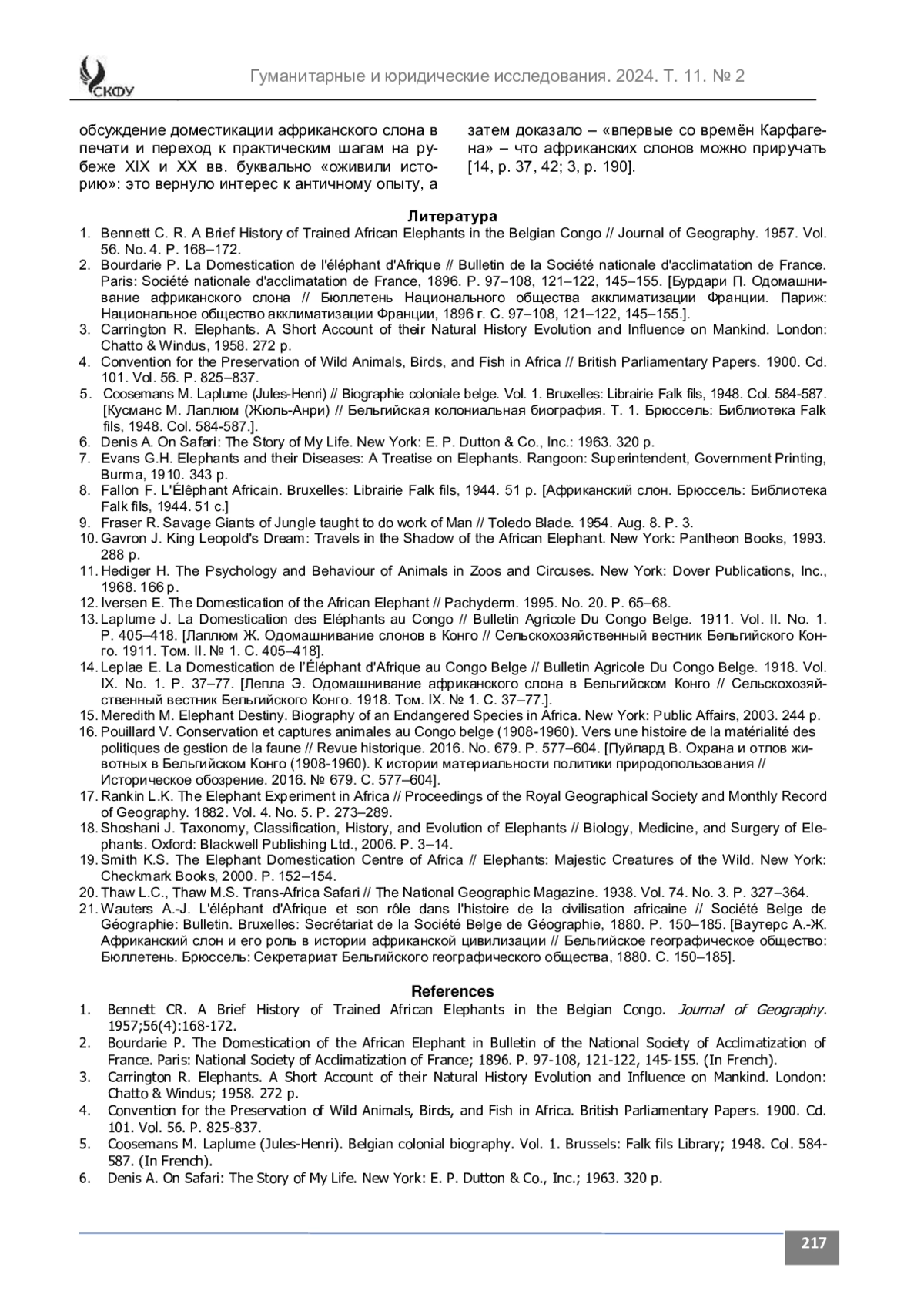 Введение. Статья посвящена малоизученному в отечественной историографии сюжету колониальной истории Африки – попытке бельгийцев в Конго при освоении труднодоступных районов использовать слонов по примеру англичан в Индии. Для этой цели в конце XIX века была основана специальная станция доместикации слонов.