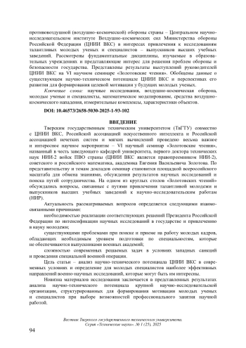 Статья: ВОЗМОЖНОСТИ ЦЕНТРАЛЬНОГО НАУЧНО-ИССЛЕДОВАТЕЛЬСКОГО ИНСТИТУТА ВОЗДУШНО-КОСМИЧЕСКИХ СИЛ МИНОБОРОНЫ РОССИИ ПО ОРГАНИЗАЦИИ НАУЧНЫХ ИССЛЕДОВАНИЙ ДЛЯ МОЛОДЫХ УЧЕНЫХ И СПЕЦИАЛИСТОВ (2025)
