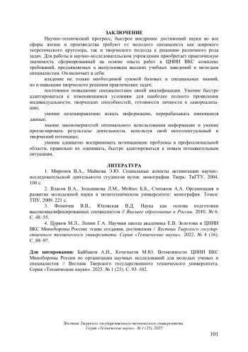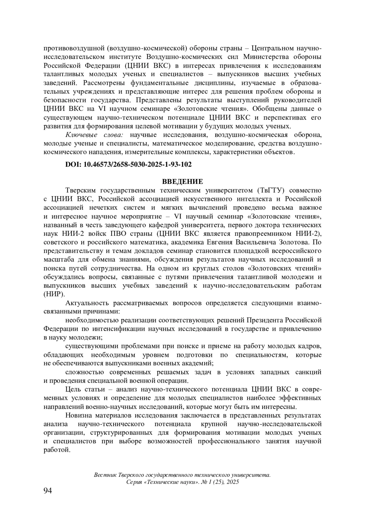 БАЙБАКОВ А. И., КОЧЕТЫГОВ М. Ю. ВОЗМОЖНОСТИ ЦЕНТРАЛЬНОГО НАУЧНО-ИССЛЕДОВАТЕЛЬСКОГО ИНСТИТУТА ВОЗДУШНО-КОСМИЧЕСКИХ СИЛ МИНОБОРОНЫ РОССИИ ПО ОРГАНИЗАЦИИ НАУЧНЫХ ИССЛЕДОВАНИЙ ДЛЯ МОЛОДЫХ УЧЕНЫХ И СПЕЦИАЛИСТОВ // ВЕСТНИК ТВЕРСКОГО ГОСУДАРСТВЕННОГО ТЕХНИЧЕСКОГО УНИВЕРСИТЕТА. СЕРИЯ: ТЕХНИЧЕСКИЕ НАУКИ. 2025. № 1 (25)