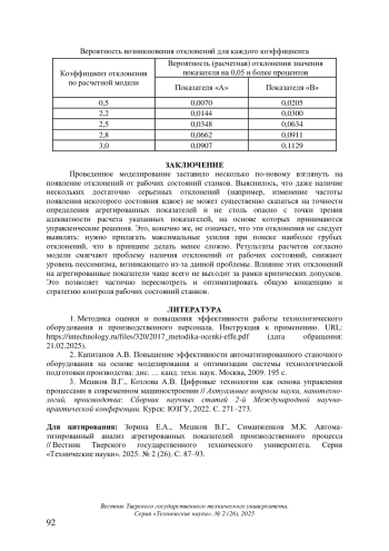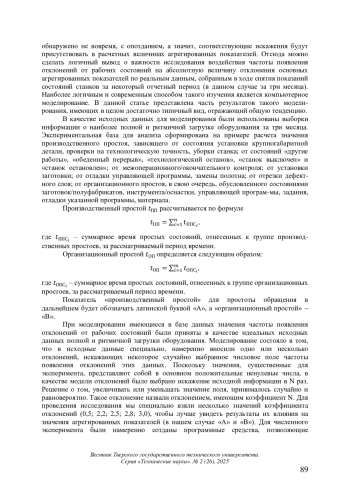 Статья посвящена исследованию воздействия частоты появления отклонений от рабочих состояний станков на значения агрегированных показателей средствами компьютерного моделирования. Подчеркнуто, что результаты расчетов показывают: даже несколько серьезных отклонений не могут существенно повлиять на точность расчета агрегированных показателей
