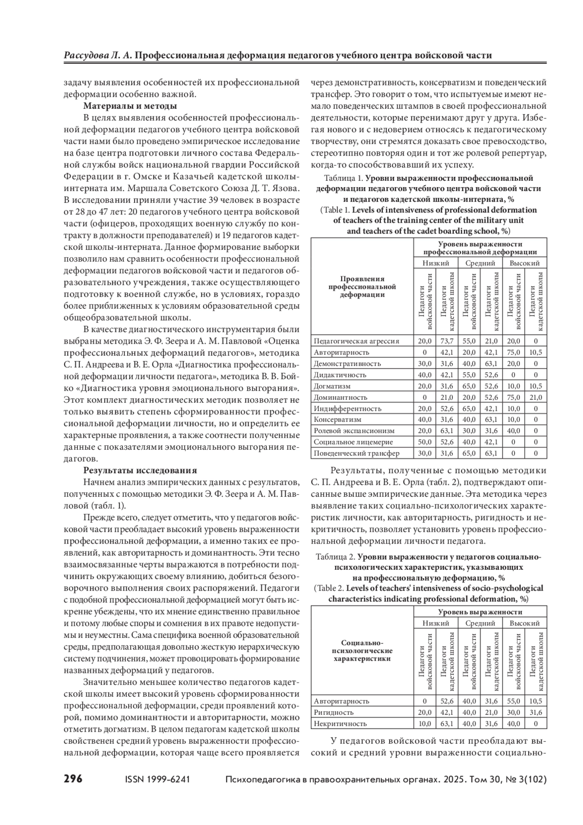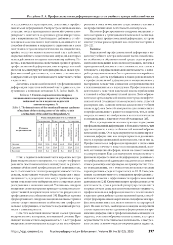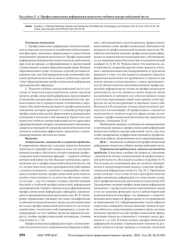 Анализируется понятие профессиональной деформации личности, рассматриваются научные подходы к данному понятию. Описывается влияние профессиональной деформации на различные сферы личности педагога. Охарактеризованы условия профессионально-педагогической деятельности педагогов учебного центра войсковой части, способствующие возникновению профессиональной деформации. Материалы и методы. Проведено эмпирическое исследование на базе центра подготовки личного состава Федеральной службы войск национальной гвардии Российской Федерации в г. Омске и Казачьей кадетской школы-интерната им. Маршала Советского Союза Д. Т. Язова. Приняли участие 39 человек в возрасте от 28 до 47 лет: 20 педагогов войсковой части (офицеров, проходящих военную службу по контракту в должности преподавателей) и 19 педагогов кадетской школы-интерната. Использовались методики Э. Ф. Зеера и А. М. Павловой «Оценка профессиональных деформаций педагогов»; С. П. Андреева и В. Е. Орла «Диагностика профессиональной деформации личности педагога» и методика В. В. Бойко «Диагностика уровня эмоционального выгорания». Результаты и обсуждение. Проведен сравнительный анализ особенностей профессиональной деформации педагогов учебного центра войсковой части и преподавателей кадетской школы-интерната. Описывается влияние профессиональной деформации на различные сферы личности педагога. Охарактеризованы условия профессионально-педагогической деятельности педагогов учебного центра войсковой части, способствующие возникновению профессиональной деформации. Выводы. Специфические условия военной образовательной среды способствуют развитию профессиональной деформации и синдрома эмоционального выгорания педагогов учебного центра войсковой части, создавая трудности в профессионально-педагогическом общении. Определена выраженность профессиональной деформации у педагогов учебного центра войсковой части с преобладанием таких ее проявлений, как авторитарность и доминантность.