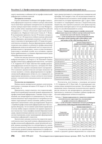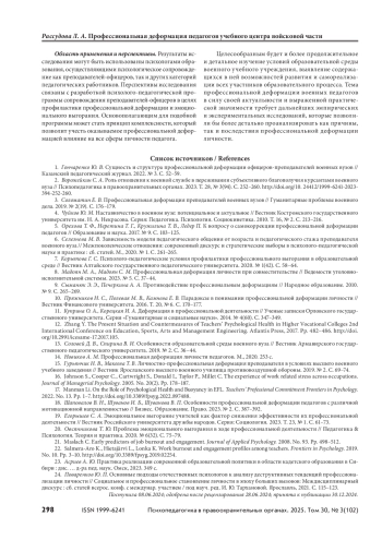1. Гончаренко Ю. В. Сущность и структура профессиональной деформации офицеров-преподавателей военных вузов // Казанский педагогический журнал. 2022. № 3. С. 52–59.