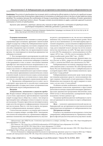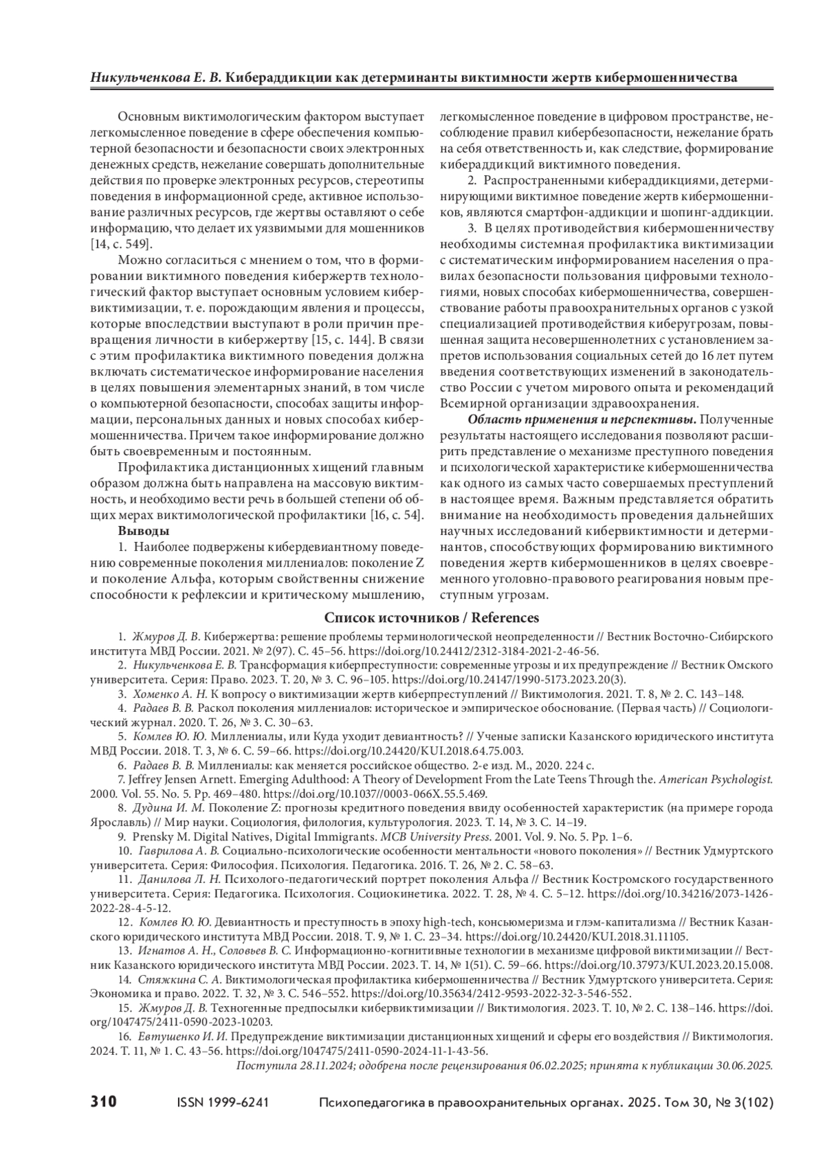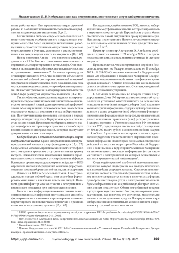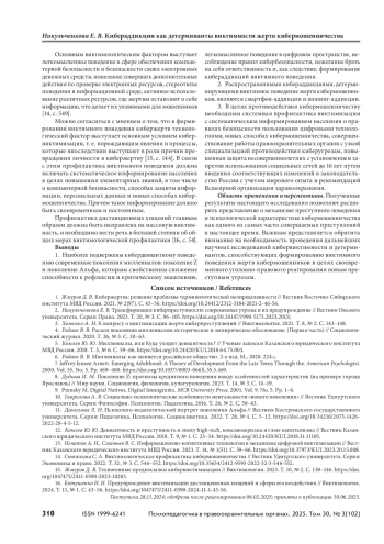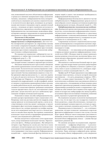НИКУЛЬЧЕНКОВА Е. В. КИБЕРАДДИКЦИИ КАК ДЕТЕРМИНАНТЫ ВИКТИМНОСТИ ЖЕРТВ КИБЕРМОШЕННИЧЕСТВА // ПСИХОПЕДАГОГИКА В ПРАВООХРАНИТЕЛЬНЫХ ОРГАНАХ. 2025. № 3 (102), ТОМ 30