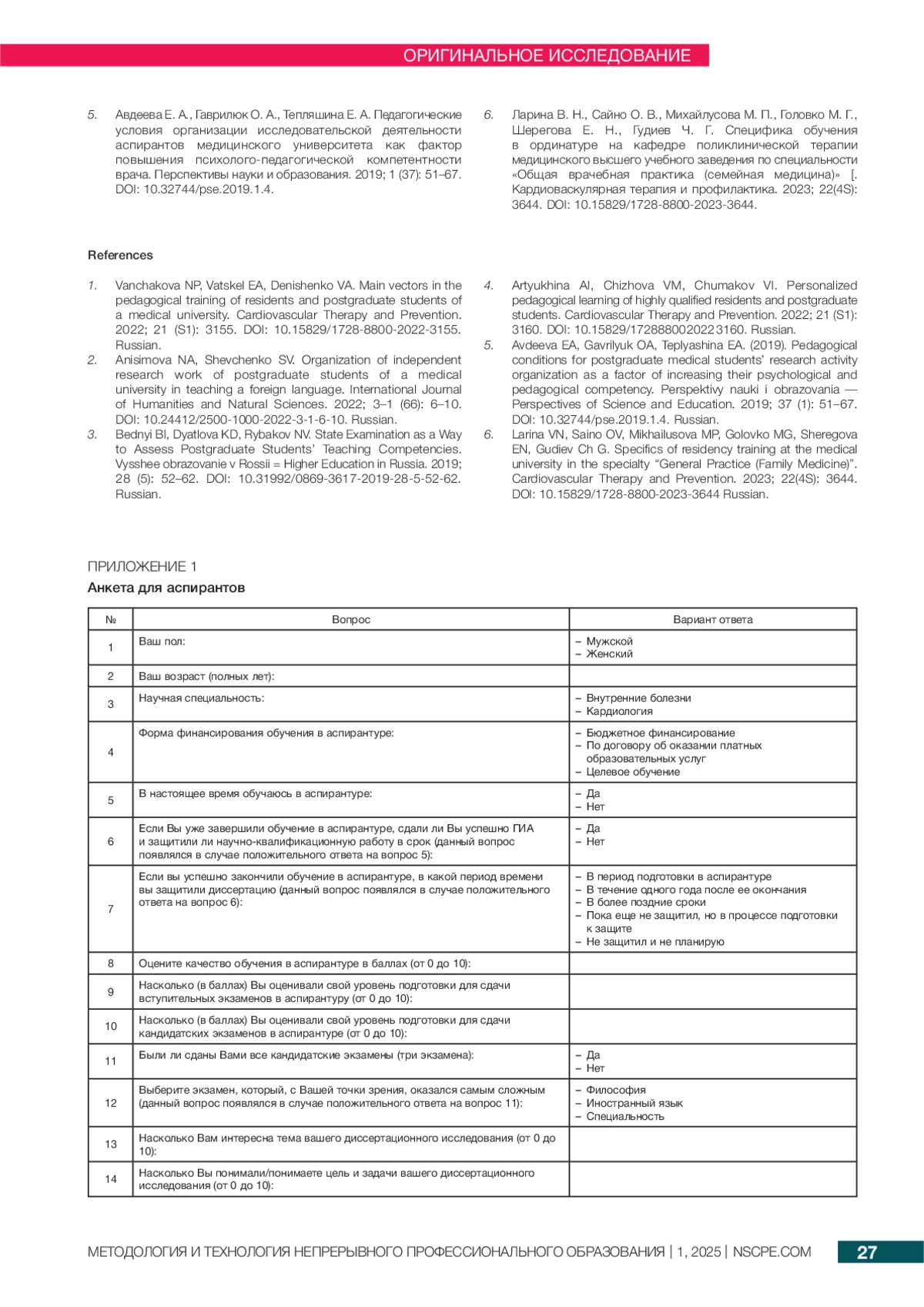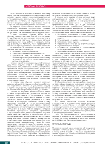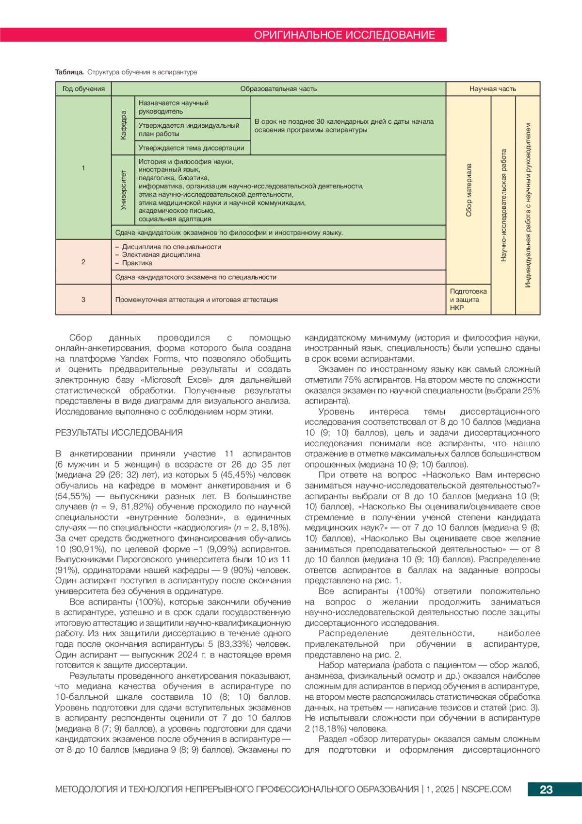 В статье проанализирована результативность обучения в аспирантуре на кафедре терапевтического профиля медицинского университета. Проведен анонимный опрос 11 аспирантов (6 мужчин и 5 женщин) в возрасте от 26 до 35 лет, обучавшихся по специальности «внутренние болезни» и «кардиология» в период с 2018 по 2024 г. Все аспиранты, которые закончили обучение в аспирантуре, успешно и в срок сдали государственную итоговую аттестацию, защитили научно-квалификационную работу и диссертацию. Ответ на вопрос «Насколько Вам интересно заниматься научно-исследовательской деятельностью?» соответствовал 10 (9; 10), «Насколько Вы оцениваете свое желание заниматься преподавательской деятельностью?» — 10 (9; 10) баллам. За желание продолжить заниматься научно-исследовательской деятельностью после защиты диссертации проголосовали все аспиранты. Сложности с набором материала отметили 55%, со статистической обработкой данных — 36%, с подготовкой раздела «обзор литературы» — 27%, «материал и методы исследования» — 18%, «собственные результаты» — 18% аспирантов. На вопрос, что необходимо улучшить при обучении в аспирантуре, 63,64% аспирантов ответили, что ничего улучшать не следует, 36,36% выбрали научно-исследовательскую подготовку, 9,09% — теоретическую подготовку на базе университета. Специфика обучения в аспирантуре на кафедре поликлинической терапии Института клинической медицины с использованием многосторонней подготовки специалистов в теоретическом, научном и педагогическом направлении способствует эффективной подготовке диссертационного исследования и ее защите в срок. Прослеживается высокая заинтересованность аспирантов в научной и педагогической деятельности.