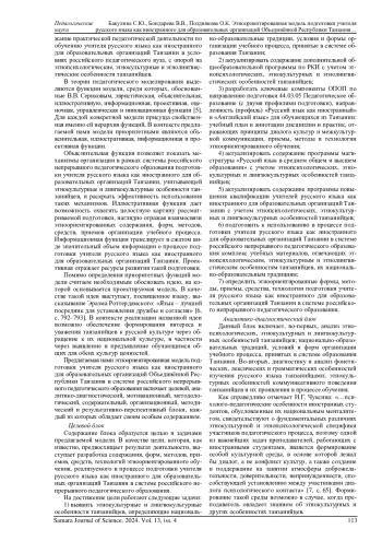 В статье обосновывается, что в условиях изменяющейся международной обстановки распространение русского языка является важным инструментом укрепления позиций России на мировой арене и формирования положительного имиджа страны. Аргументируется необходимость разработки этноориентированной модели подготовки учителя русского языка как иностранного для образовательных организаций Объединённой Республике Танзания в системе российского непрерывного педагогического образования, нацеленной (модель) на кадровое обеспечение процесса преподавания РКИ в Танзании с учетом специфики национальной системы образования страны, а также этнокультурных особенностей целевой аудитории. Доказывается, что разрабатываемая модель являет собой нормативную модель, отражающую представления о том, какими должны быть содержание, приемы, формы и средства организации образовательного процесса, обеспечивающие эффективную профессиональную подготовку учителей русского языка как иностранного для образовательных организаций Танзании из числа танзанийцев, обучающихся в России. Определяются приоритетные функции модели: объяснительная, иллюстративная, информационная и проективная функции. Обосновывается блочная структура модели и раскрывается содержание целевого, аналитико-диагностического, мотивационного, методологического, содержательного, методического и результативно-перспективного блоков. Раскрывается сущность этноориентированного, культурологического, аксиологического, коммуникативного и компетентностного подходов к организации подготовки учителя русского языка как иностранного для образовательных организаций Объединённой Республики Танзания в системе российского непрерывного педагогического образования и выявляются принципы реализации подходов: принцип национальной контекстности обучения, принцип учета национально-личностных характеристик обучающихся, принцип учета особенностей национальной системы образования обучающихся, принцип адаптационной направленности обучения РКИ иностранных студентов в системе российского образования, принцип международной интеграции, программно-целевой принцип, принцип учета родного языка и культуры обучающихся (этноориентированный подход); принцип диалога культур, принцип культуросообразности (культурологический подход); принцип ценностной ориентации, принцип субъектности (аксиологический подход); принцип функциональности, принцип новизны (коммуникативный подход); принцип дидактической последовательности, принцип личностной ориентированности (компетентностный подход).