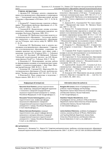 1. Афонина Р.Н. Основные аспекты совершенствования естественнонаучного образования в гуманитарном вузе // Электронный научно-образовательный вестник “Здоровье и образование в XXI веке”. 2017. Т. 19, № 10. С. 3-9. EDN: ZQOJZZ