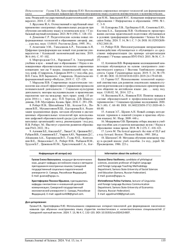 3. Яруллина Ж.А. Отечественный и зарубежный опыт применения электронных образовательных ресурсов при обучении английскому языку в техническом вузе // Глобальный научный потенциал. 2023. № 9 (150). С. 128-132. EDN: NAWCKX