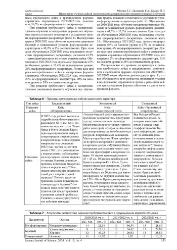 В статье рассматриваются возможности применения кейс-метода в условиях смешанного формата обучения биологии. Рассмотрены разные подходы к определению понятий «смешанное обучение» и «кейс-метод». Авторами представлена матрица кейсов в содержании курса «Исследователь Арктики», разработаны критерии оценки решения разных типов кейсов, приведена подробная характеристика долгосрочного и краткосрочного кейсов, описана их структура, составлены методические рекомендации к выполнению дорожной карты кейса. В дорожной карте проблемного кейса раскрыты этапы его решения, педагогическая задача и предполагаемый результат. Отдельно уделено внимание особенностям проблемного, иллюстративного и оценочного типа кейсов, представлена их структура, отличия и сходства. В статье обсуждаются результаты решения обучающимися долгосрочных и краткосрочных кейсов в процессе изучения курса «Исследователь Арктики», реализованного в формате смешанного обучения в 2020/2021-2022/2023 уч. г. Авторами представлены данные исследования, полученные при традиционном формате обучения, электронном формате обучения и смешанном формате обучения. По результатам исследования выявлено влияние пандемии Covid-19 на образовательный процесс. Исследуемые группы обучающихся показали высокую приспособленность к новой образовательной среде, сформированной по итогам применения дистанционного обучения во время пандемии Covid-19.