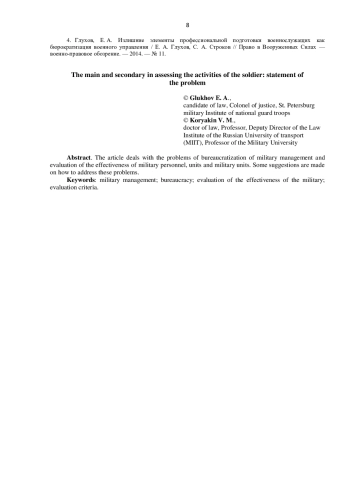 Глухов, Е. А. Главное и второстепенное при оценке деятельности военнослужащего: постановка проблемы / Е. А. Глухов, В. М. Корякин // Военное право. – 2018. – № 2(48). – С. 17-24. – EDN YTMKSP.
