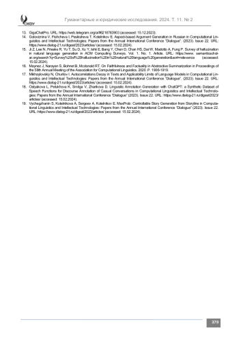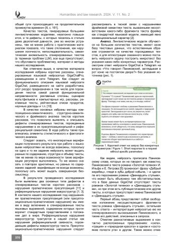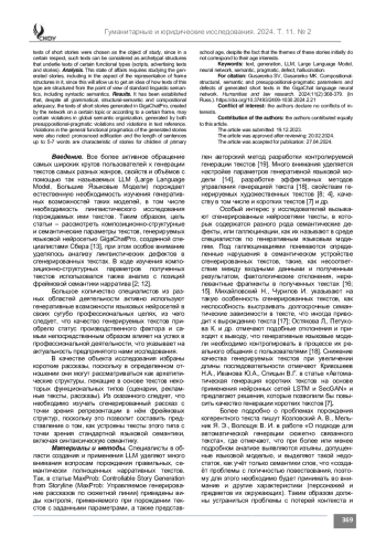ГУСАРЕНКО С. В., ГУСАРЕНКО М. К. КОМПОЗИЦИОННО-СТРУКТУРНЫЕ, СЕМАНТИЧЕСКИЕ И ПРЕСУППОЗИЦИОНАЛЬНО-ПРАГМАТИЧЕСКИЕ ПАРАМЕТРЫ И ДЕФЕКТЫ СГЕНЕРИРОВАННЫХ КОРОТКИХ ТЕКСТОВ В ЯЗЫКОВОЙ НЕЙРОСЕТИ GIGACHAT // ГУМАНИТАРНЫЕ И ЮРИДИЧЕСКИЕ ИССЛЕДОВАНИЯ. 2024. ТОМ 11, № 2
