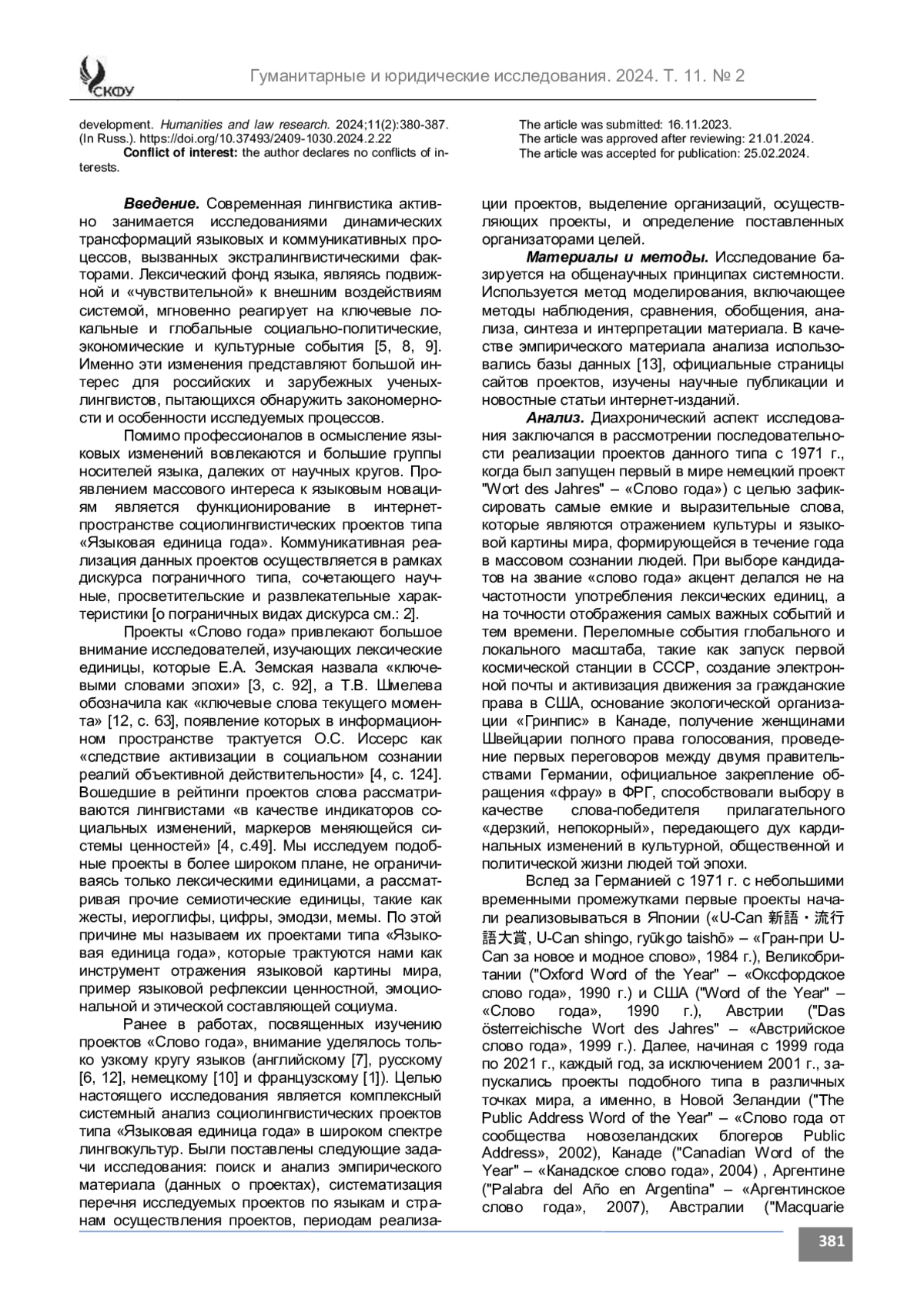 ДОЛГАЯ Т. А. СОЦИОЛИНГВИСТИЧЕСКИЕ ПРОЕКТЫ ТИПА «ЯЗЫКОВАЯ ЕДИНИЦА ГОДА»: ТИПОЛОГИЯ И ДИНАМИКА РАЗВИТИЯ // ГУМАНИТАРНЫЕ И ЮРИДИЧЕСКИЕ ИССЛЕДОВАНИЯ. 2024. ТОМ 11, № 2