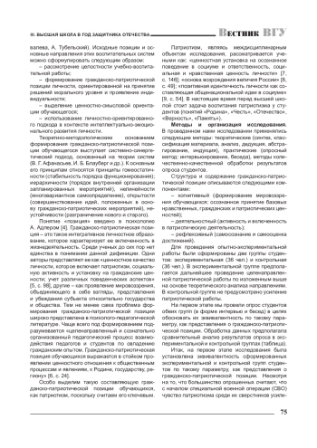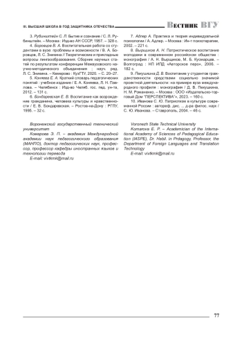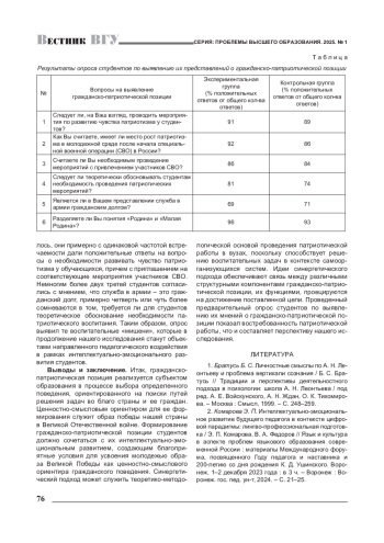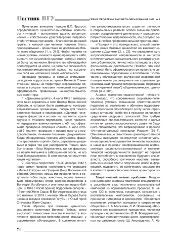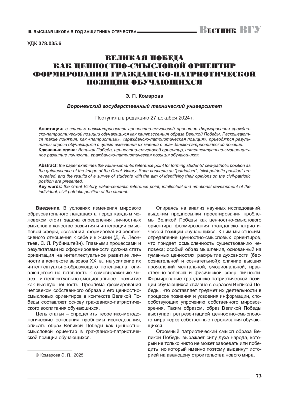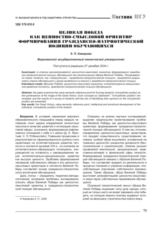 КОМАРОВА Э. П. ВЕЛИКАЯ ПОБЕДА КАК ЦЕННОСТНО-СМЫСЛОВОЙ ОРИЕНТИР ФОРМИРОВАНИЯ ГРАЖДАНСКО-ПАТРИОТИЧЕСКОЙ ПОЗИЦИИ ОБУЧАЮЩИХСЯ // ВЕСТНИК ВОРОНЕЖСКОГО ГОСУДАРСТВЕННОГО УНИВЕРСИТЕТА. СЕРИЯ: ПРОБЛЕМЫ ВЫСШЕГО ОБРАЗОВАНИЯ. 2025. № 1