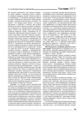 Представлен анализ педагогических традиций Московского государственного университета имени М. В. Ломоносова, созданных педагогическим гением плеяды ученых в области педагогики, психологии, философии, признанных сегодня классиками, которые работали в МГУ в разные годы. По мнению автора, эти традиции заложены преимущественно нашим великим соотечественником М. В. Ломоносовым, который, по сути, являлся основателем учебного заведения. В статье сделан акцент на активной педагогической деятельности М. В. Ломоносова, актуальности разработанных им принципов и методов обучения и воспитания, идей развития среднего и высшего образования в России. Автор отмечает, что педагогическое наследие, представленное в традициях обучения и воспитания, основах преподавания различных учебных дисциплин, позволяет и сегодня ученым, преподавателям, наставникам молодежи обогащать теоретические и практические знания и навыки в области педагогики.