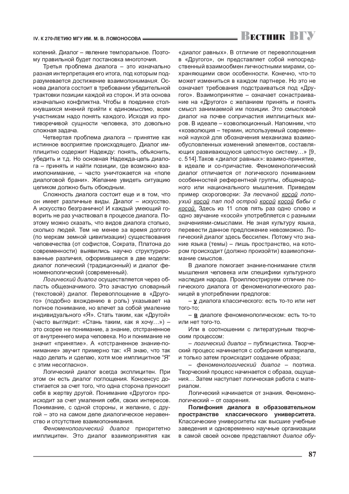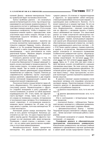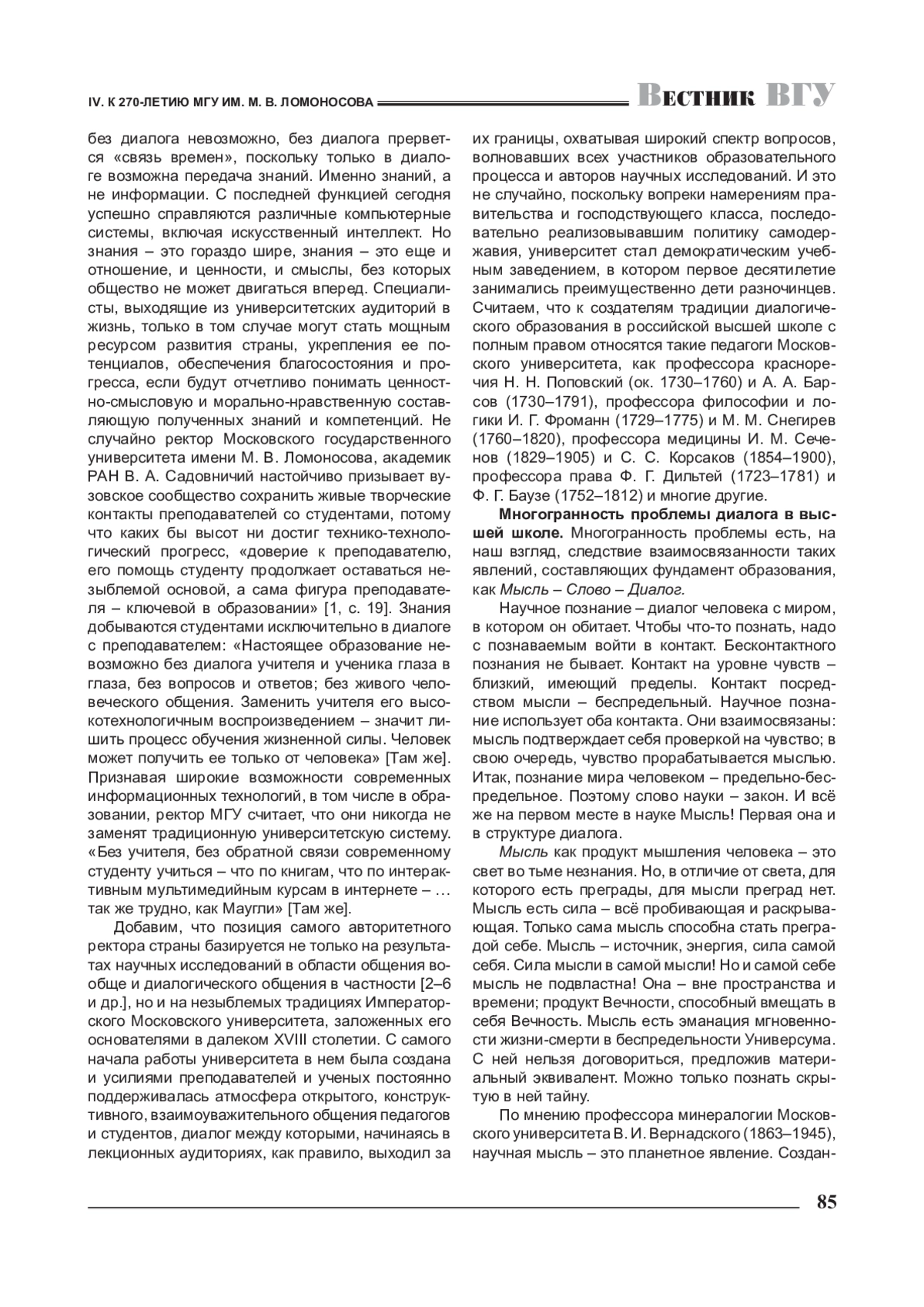 В статье затрагивается тема диалога в образовательном пространстве классического университета. Подчеркивается, что диалогизм образовательного процесса - это одна из традиций отечественного университетского образования, заложенная основателями Московского государственного университета. В статье обсуждаются понятие диалога и сложности самого процесса. Дается обобщенная характеристика проблемы диалога в высшей школе. Излагаются взгляды автора на проблему. В заключение раскрывается полифонизм диалога в образовательном пространстве университетов.