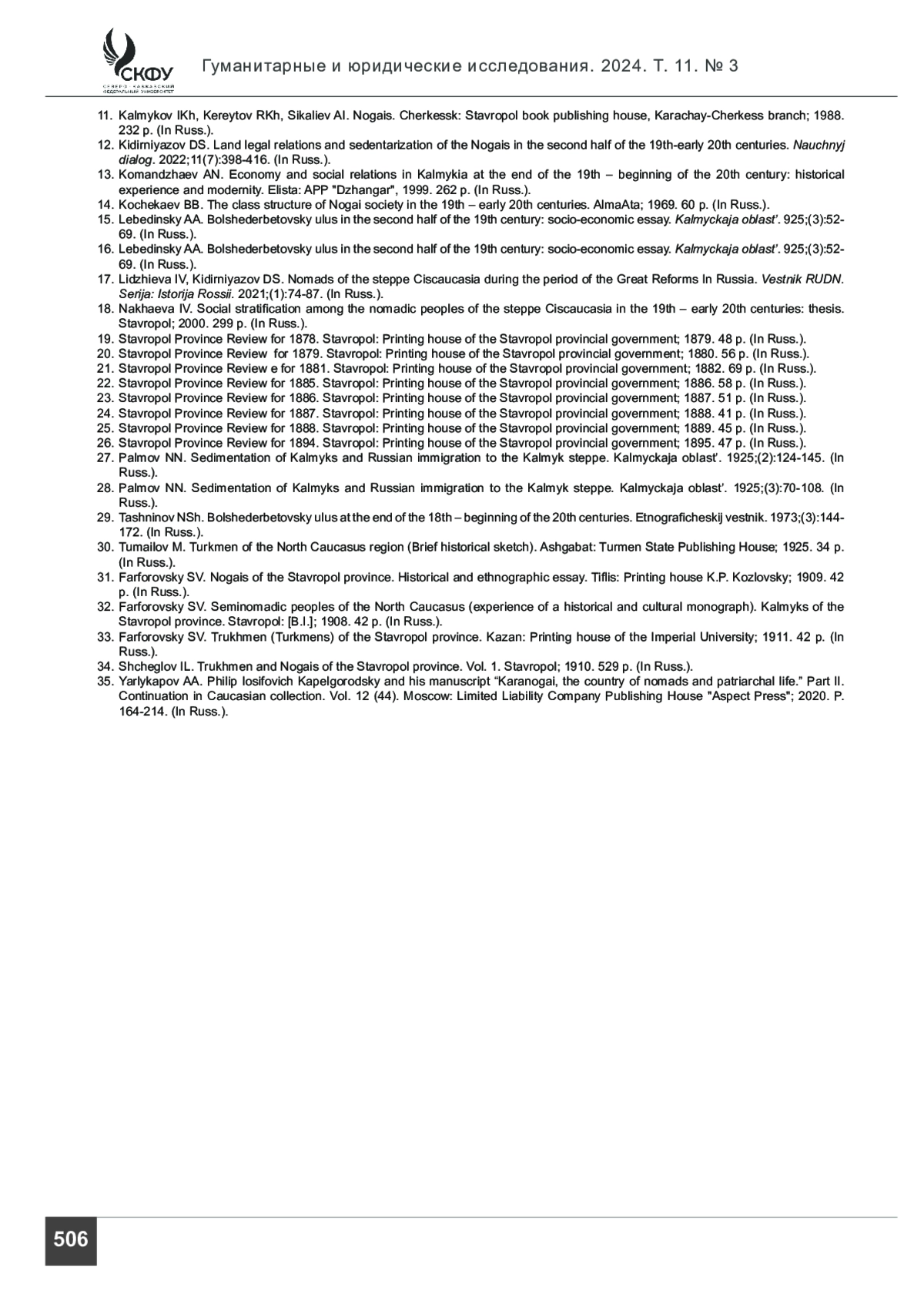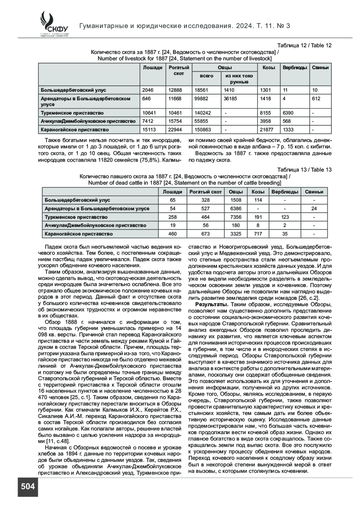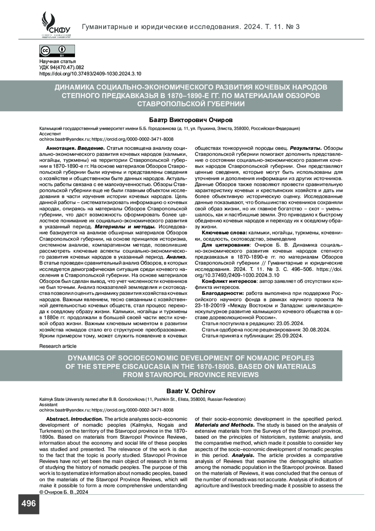 ОЧИРОВ Б. В. ДИНАМИКА СОЦИАЛЬНО-ЭКОНОМИЧЕСКОГО РАЗВИТИЯ КОЧЕВЫХ НАРОДОВ СТЕПНОГО ПРЕДКАВКАЗЬЯ В 1870-1890-Е ГГ. ПО МАТЕРИАЛАМ ОБЗОРОВ СТАВРОПОЛЬСКОЙ ГУБЕРНИИ // ГУМАНИТАРНЫЕ И ЮРИДИЧЕСКИЕ ИССЛЕДОВАНИЯ. 2024. ТОМ 11, № 3