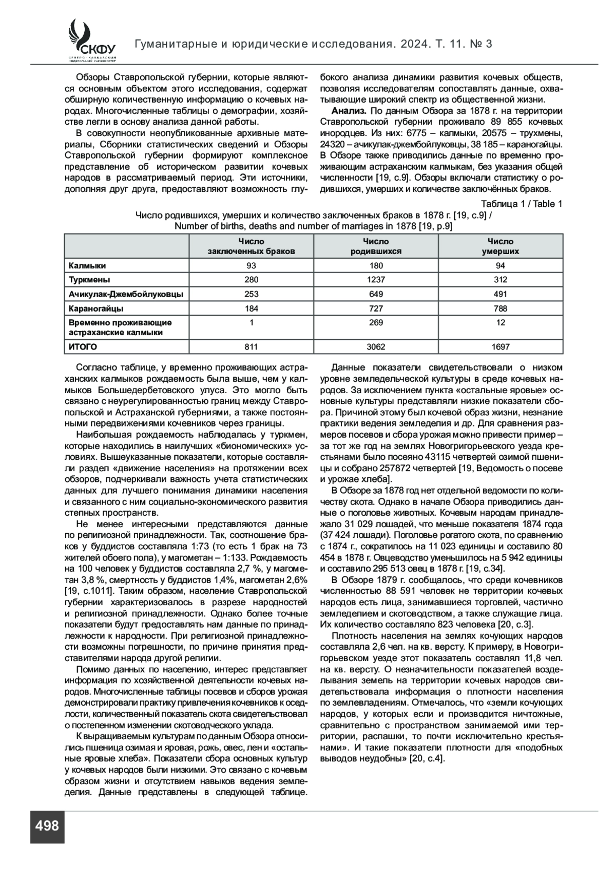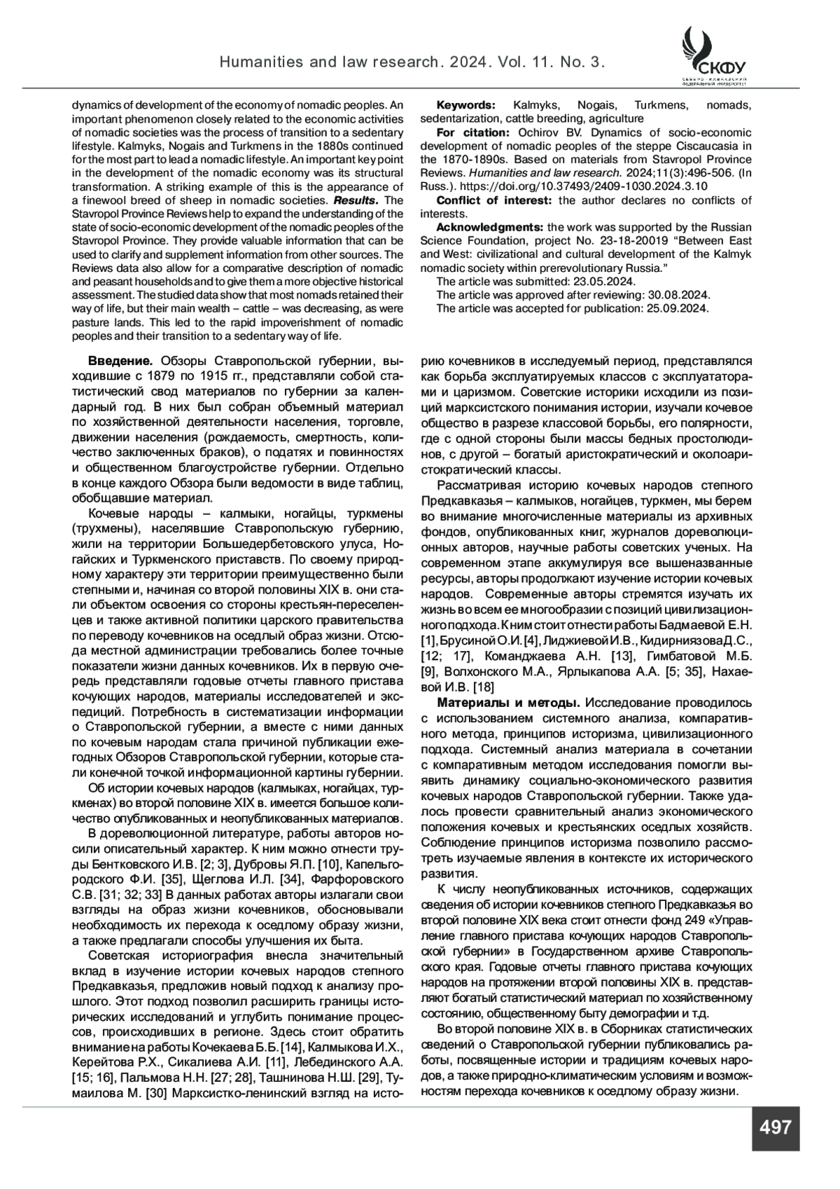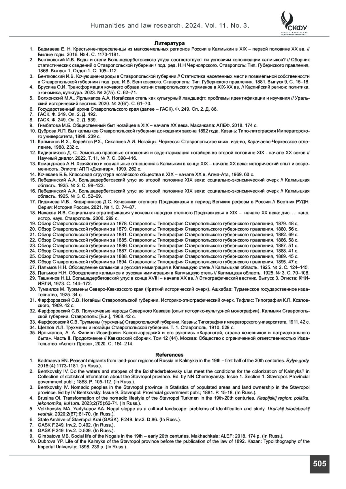 ОЧИРОВ Б. В. ДИНАМИКА СОЦИАЛЬНО-ЭКОНОМИЧЕСКОГО РАЗВИТИЯ КОЧЕВЫХ НАРОДОВ СТЕПНОГО ПРЕДКАВКАЗЬЯ В 1870-1890-Е ГГ. ПО МАТЕРИАЛАМ ОБЗОРОВ СТАВРОПОЛЬСКОЙ ГУБЕРНИИ // ГУМАНИТАРНЫЕ И ЮРИДИЧЕСКИЕ ИССЛЕДОВАНИЯ. 2024. ТОМ 11, № 3