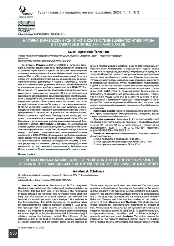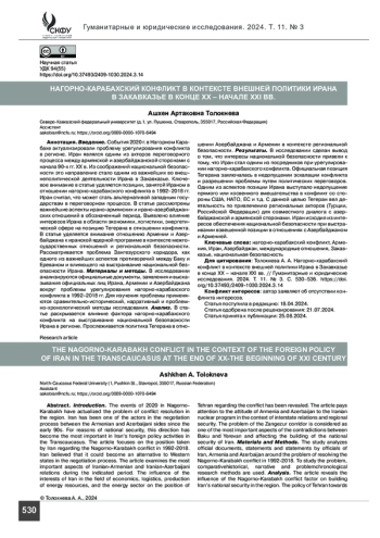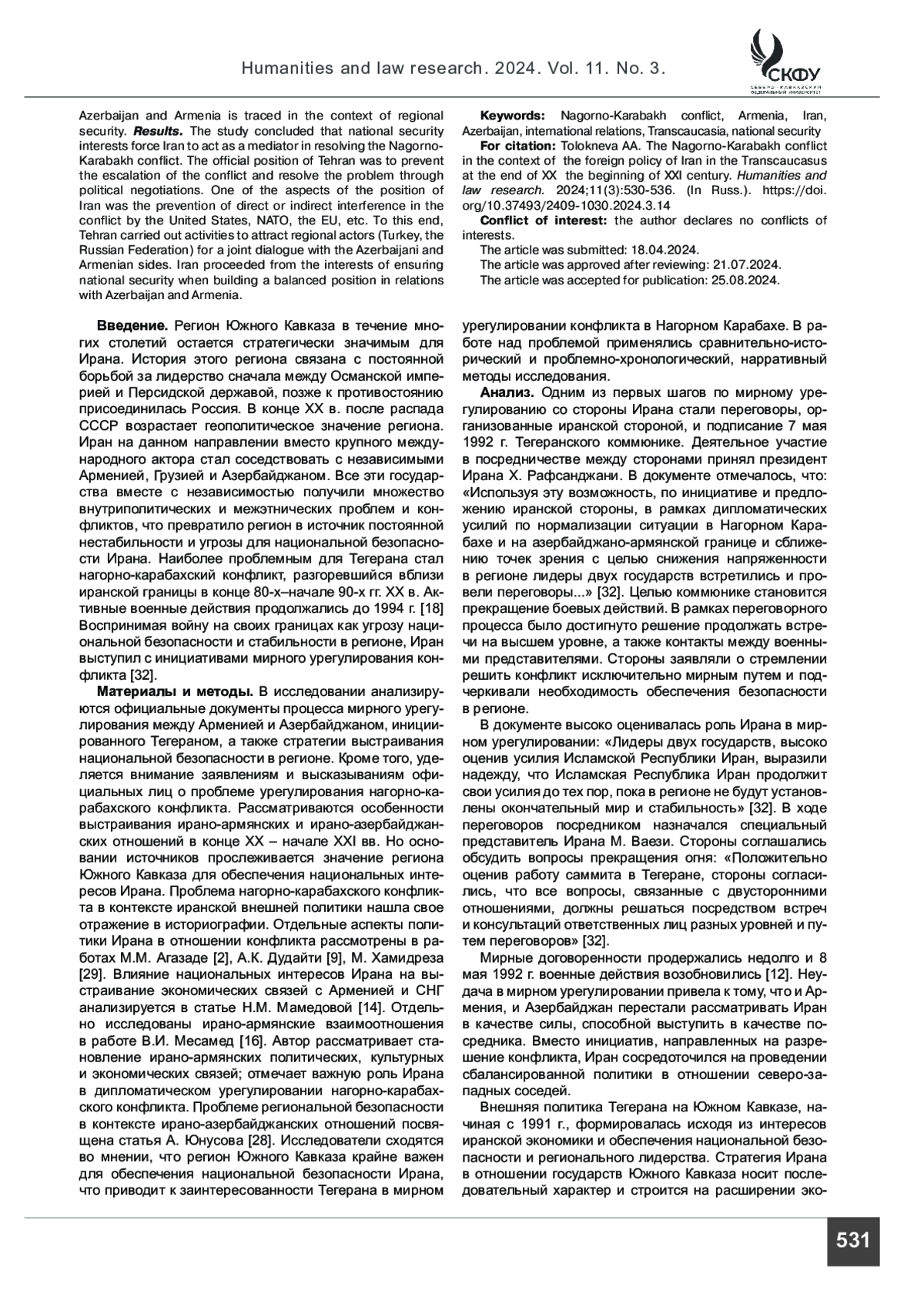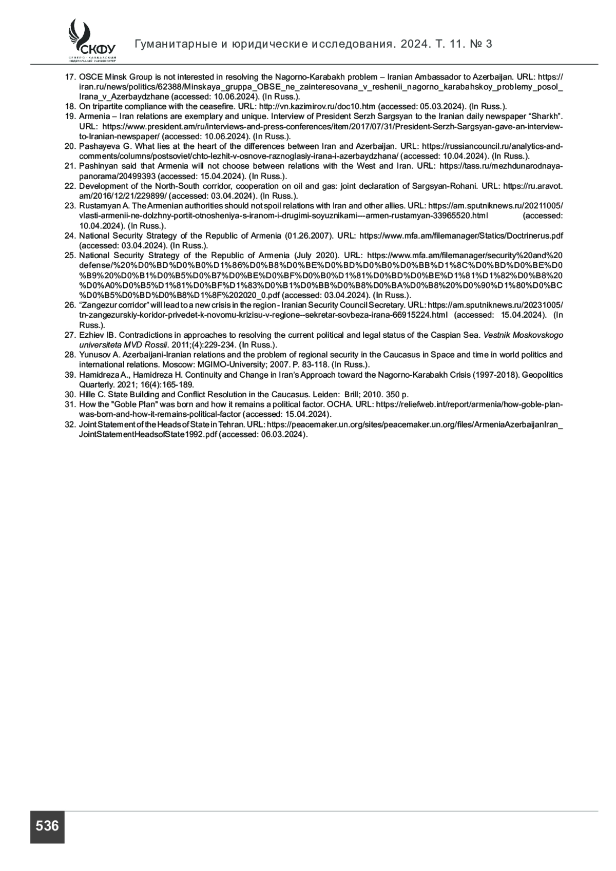 ТОЛОКНЕВА А. А. НАГОРНО-КАРАБАХСКИЙ КОНФЛИКТ В КОНТЕКСТЕ ВНЕШНЕЙ ПОЛИТИКИ ИРАНА В ЗАКАВКАЗЬЕ В КОНЦЕ ХХ – НАЧАЛЕ XXI ВВ. // ГУМАНИТАРНЫЕ И ЮРИДИЧЕСКИЕ ИССЛЕДОВАНИЯ. 2024. ТОМ 11, № 3