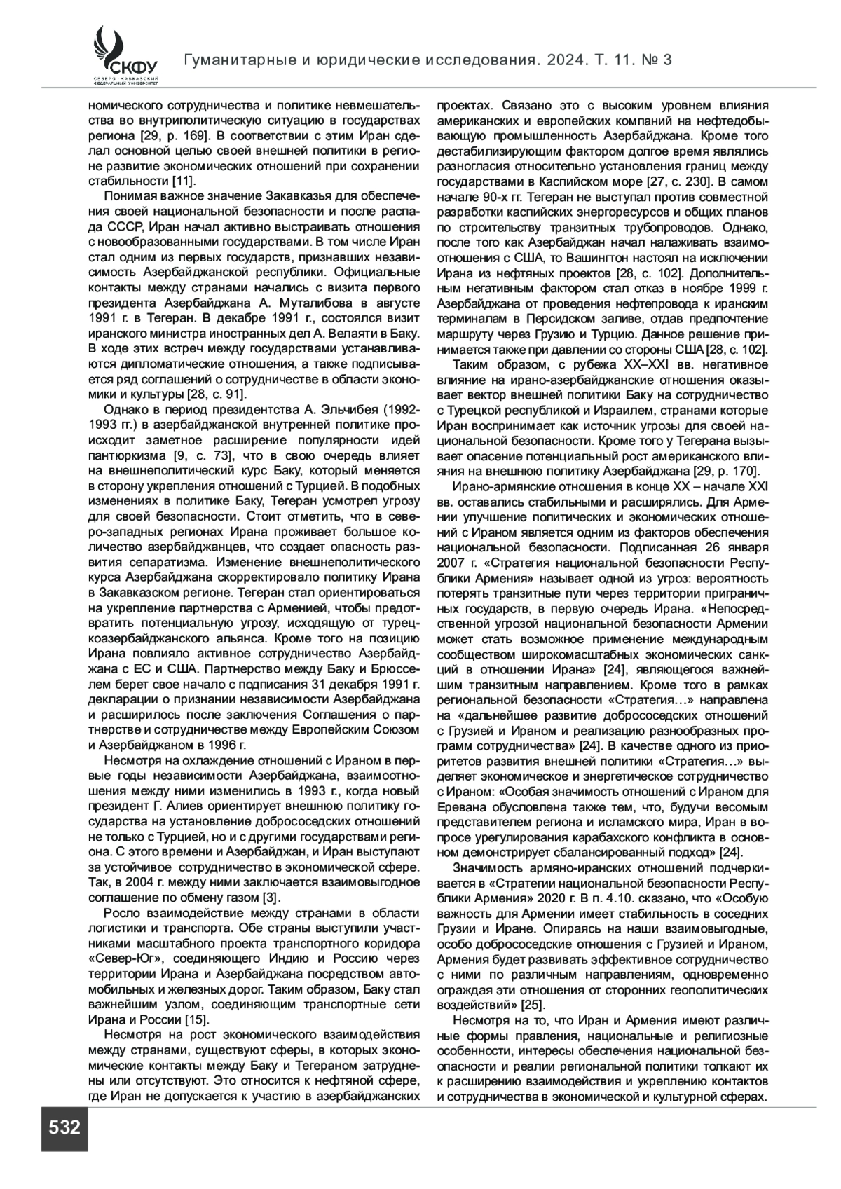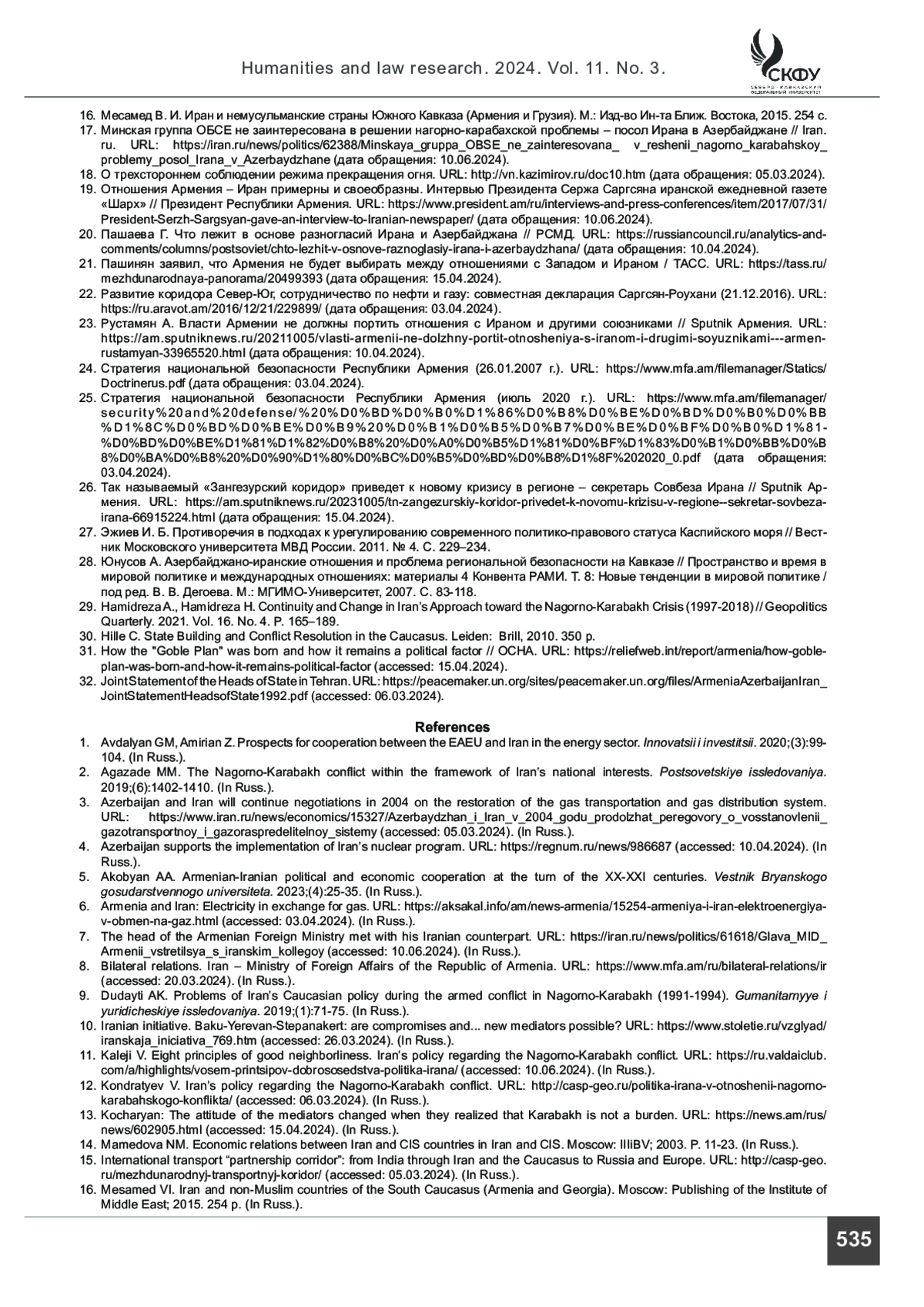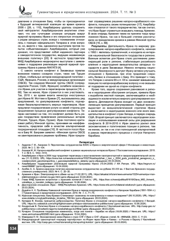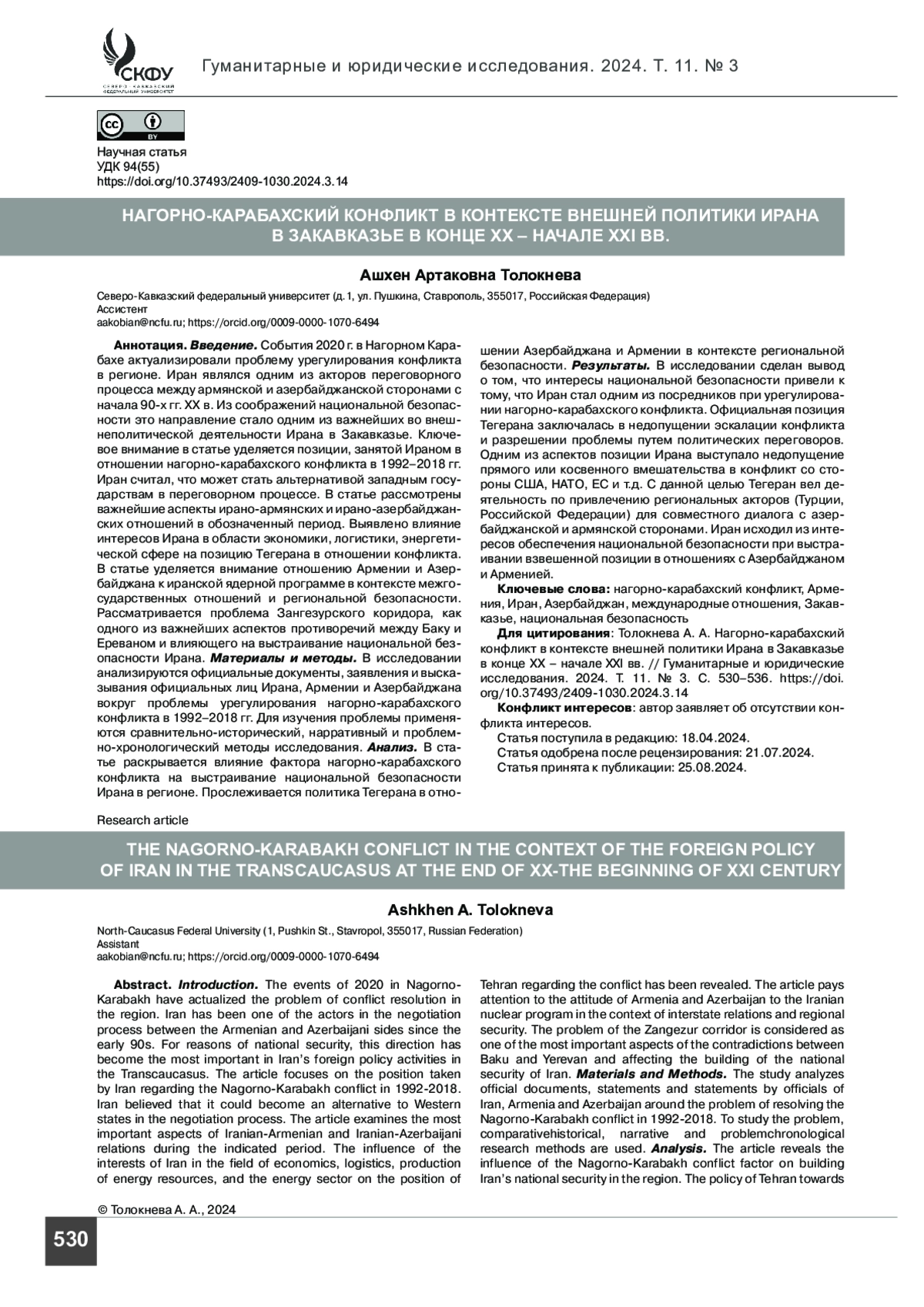 ТОЛОКНЕВА А. А. НАГОРНО-КАРАБАХСКИЙ КОНФЛИКТ В КОНТЕКСТЕ ВНЕШНЕЙ ПОЛИТИКИ ИРАНА В ЗАКАВКАЗЬЕ В КОНЦЕ ХХ – НАЧАЛЕ XXI ВВ. // ГУМАНИТАРНЫЕ И ЮРИДИЧЕСКИЕ ИССЛЕДОВАНИЯ. 2024. ТОМ 11, № 3