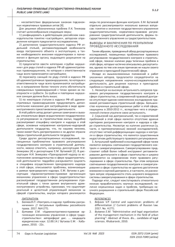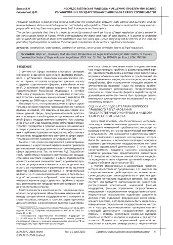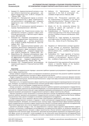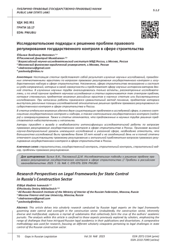 Статья: ИССЛЕДОВАТЕЛЬСКИЕ ПОДХОДЫ К РЕШЕНИЮ ПРОБЛЕМ ПРАВОВОГО РЕГУЛИРОВАНИЯ ГОСУДАРСТВЕННОГО КОНТРОЛЯ В СФЕРЕ СТРОИТЕЛЬСТВА (2023)