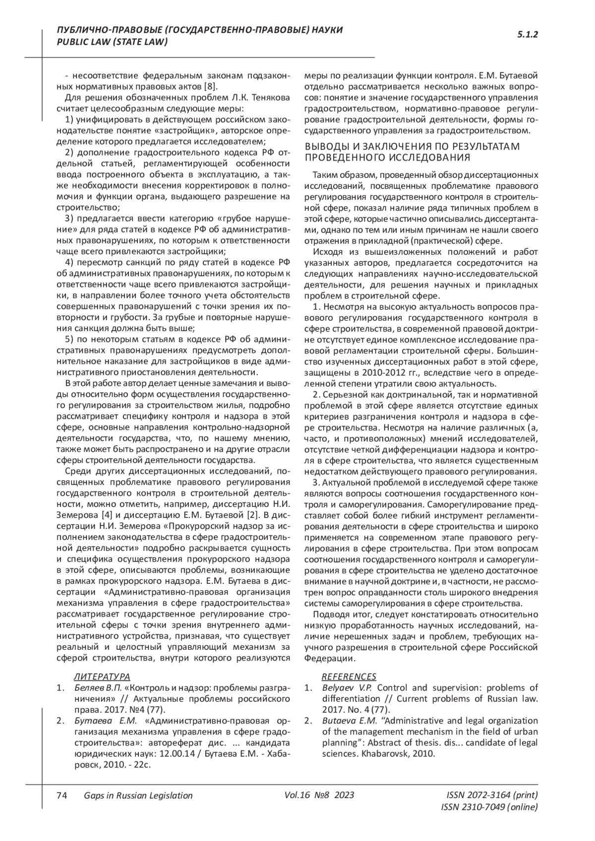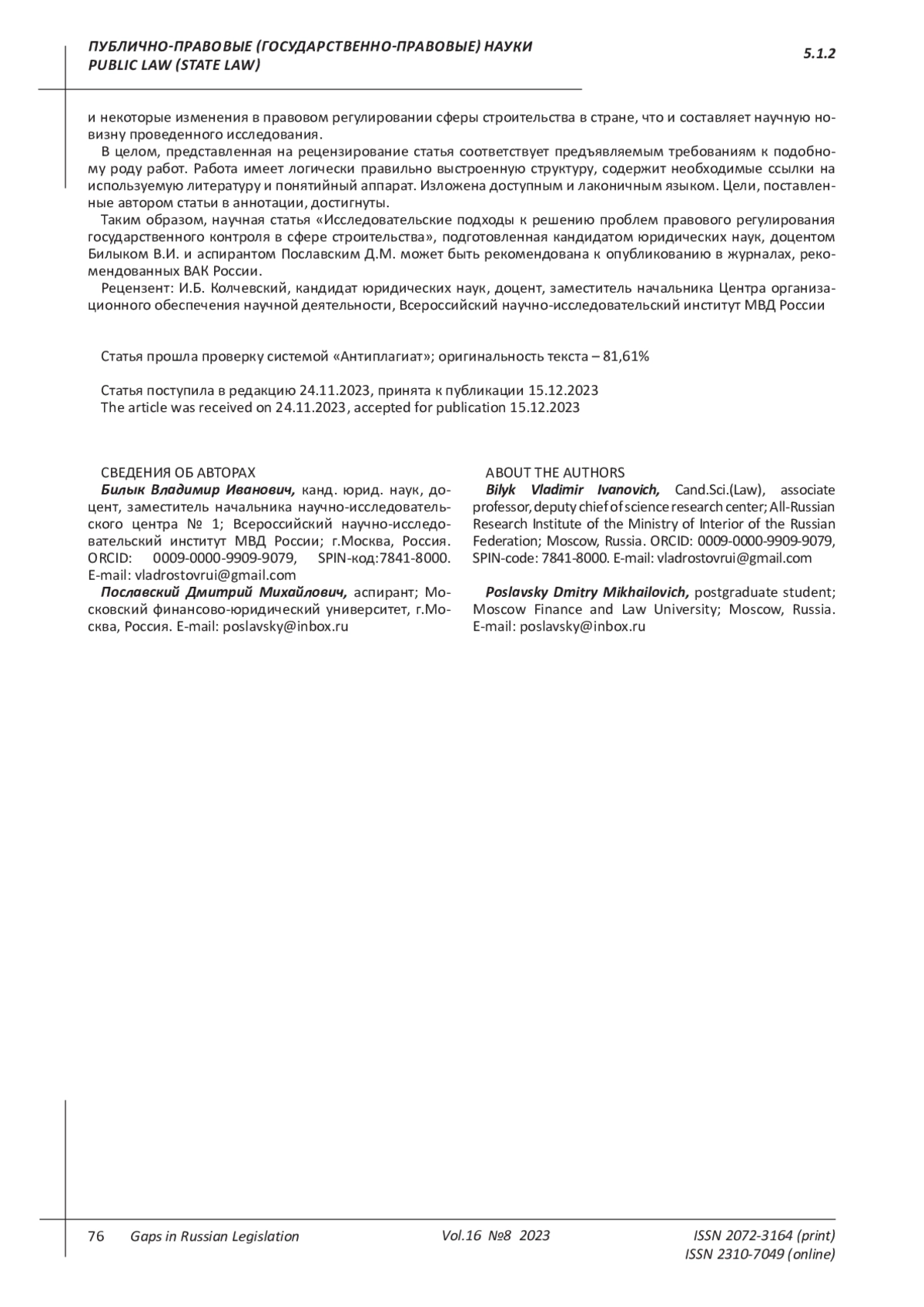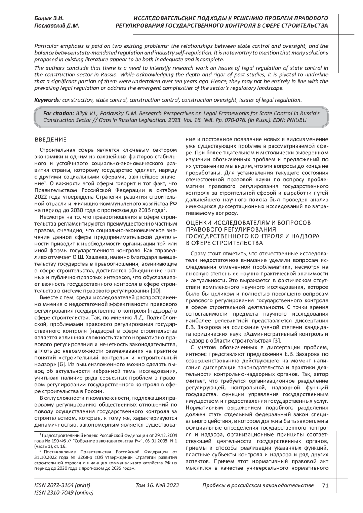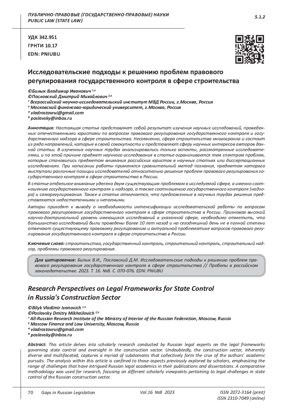 БИЛЫК В. И., ПОСЛАВСКИЙ Д. М. ИССЛЕДОВАТЕЛЬСКИЕ ПОДХОДЫ К РЕШЕНИЮ ПРОБЛЕМ ПРАВОВОГО РЕГУЛИРОВАНИЯ ГОСУДАРСТВЕННОГО КОНТРОЛЯ В СФЕРЕ СТРОИТЕЛЬСТВА // ПРОБЕЛЫ В РОССИЙСКОМ ЗАКОНОДАТЕЛЬСТВЕ. 2023. Т. 16 № 8 (36 СТ.)