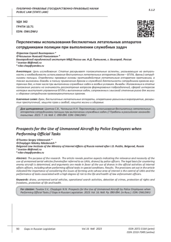 Цель исследования: Статья раскрывает положительные аспекты, указывающие на актуальность и необходимость использования беспилотных летательных аппаратов (далее - БПЛА, дроны) сотрудниками полиции. Определены правовые основы противодействия летательным аппаратам противника, а также высказаны доводы в пользу применения дронов в служебной деятельности сотрудников органов внутренних дел, в том числе при выполнении служебных задач в особых условиях. Выводы: Изложенные в статье положения указали на значимость рассмотрения вопросов формирования подразделений, сферой интересов которых выступает управление БПЛА и выполнение задач, сопряженных с высокой степенью риска для жизни и здоровья сотрудников правоохранительных органов.