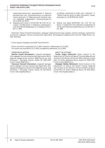 Federal Law dated 02/07/2011 No. 3-FZ “On the Police” // published in the Collection of Legislation of the Russian Federation dated February 14, 2011 No. 7 Art. 900.