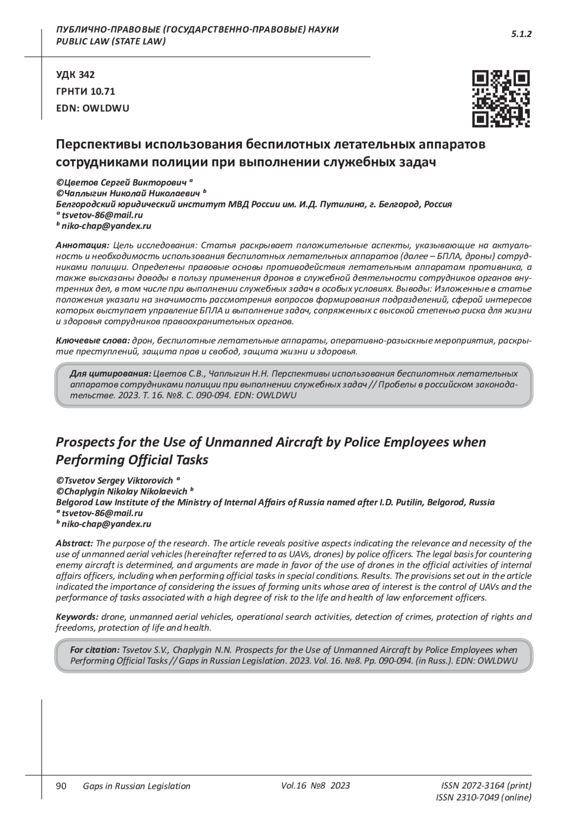 6. Шубакин А.А. Особенности несения службы сотрудниками патрульно-постовой службы полиции в общественных местах при угрозе появления БПЛА. Право и управление. 2023 №10 С. 36-43. DOI: 10.24412/2224-9133-2023-10-36-43 EDN: HUNWAS