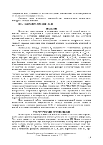 Исследовано влияние волнистости технических поверхностей на контактное взаимодействие деталей машин. Приведены параметры шероховатости и волнистости поверхностей экспериментальных образцов по ГОСТ Р ИСО 4287-2014, механические свойства материалов образцов, дано описание методики эксперимента. Предложены теоретические зависимости контурной площади контакта от номинального давления, параметров шероховатости и волнистости контактирующих поверхностей и механических свойств материалов контактирующих деталей. Теоретически и экспериментально показано, что волнистость существенно влияет на величину площади контакта деталей машин. Отмечено, что в зависимости от величины номинального контактного давления контурная площадь, образовавшаяся в результате упругой деформации волн, составляет от нескольких единиц до нескольких десятков процентов от номинальной площади контакта