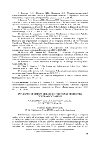 БОЛОТОВ А. Н., НОВИКОВ В. В., НОВИКОВА О. О. ВЛИЯНИЕ ДИСПЕРСНЫХ НАПОЛНИТЕЛЕЙ НА ФРИКЦИОННЫЕ СВОЙСТВА КЕРАМИЧЕСКИХ ПОКРЫТИЙ // ВЕСТНИК ТВЕРСКОГО ГОСУДАРСТВЕННОГО ТЕХНИЧЕСКОГО УНИВЕРСИТЕТА. СЕРИЯ: ТЕХНИЧЕСКИЕ НАУКИ. 2024. № 1 (21)