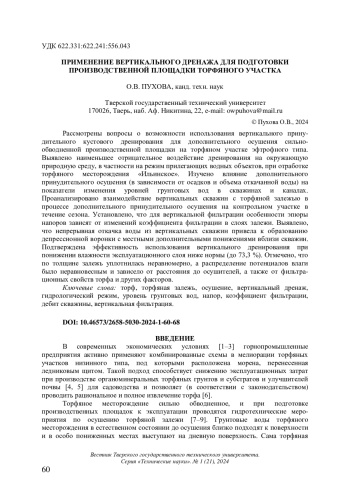 Статья: ПРИМЕНЕНИЕ ВЕРТИКАЛЬНОГО ДРЕНАЖА ДЛЯ ПОДГОТОВКИ ПРОИЗВОДСТВЕННОЙ ПЛОЩАДКИ ТОРФЯНОГО УЧАСТКА (2024)