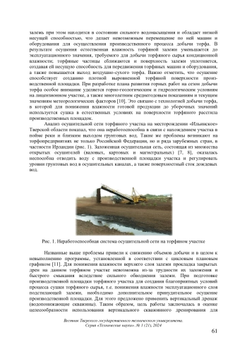 Рассмотрены вопросы о возможности использования вертикального принудительного кустового дренирования для дополнительного осушения сильнообводненной производственной площадки на торфяном участке эфтрофного типа. Выявлено наименьшее отрицательное воздействие дренирования на окружающую природную среду, в частности на режим прилегающих водных объектов, при отработке торфяного месторождения «Ильинское». Изучено влияние дополнительного принудительного осушения (в зависимости от осадков и объема откачанной воды) на показатели изменения уровней грунтовых вод в скважинах и каналах. Проанализировано взаимодействие вертикальных скважин с торфяной залежью в процессе дополнительного принудительного осушения на контрольном участке в течение сезона. Установлено, что для вертикальной фильтрации особенности эпюры напоров зависят от изменений коэффициента фильтрации в слоях залежи. Выявлено, что непрерывная откачка воды из вертикальных скважин привела к образованию депрессионной воронки с местными дополнительными понижениями вблизи скважин. Подтверждена эффективность использования вертикального дренирования при понижении влажности эксплуатационного слоя ниже нормы (до 73,3 %). Отмечено, что по толщине залежь уплотнилась неравномерно, а распределение потенциалов влаги было неравновесным и зависело от расстояния до осушителей, а также от фильтрационных свойств торфа и других факторов