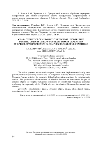 2. Катулев А.Н., Храмичев А.А., Гузенко О.Б. Критерий и алгоритм обнаружения динамического объекта на сложном фоне по точечному слабоконтрастному изображению оптико-электронного прибора // Автометрия. 2015. Т. 51. № 2. С. 38-48. EDN: TSZEWB