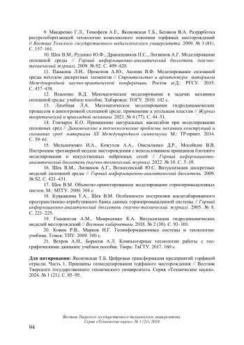 4. Яконовская Т.Б. К вопросу о качестве геологической информации в торфяной сфере хозяйственной деятельности // Социально-экономические и экологические проблемы горной промышленности, строительства и энергетики: материалы 17-й международной конференции. Тула: ТулГУ. 2021. С. 488-492. EDN: GWZUZB