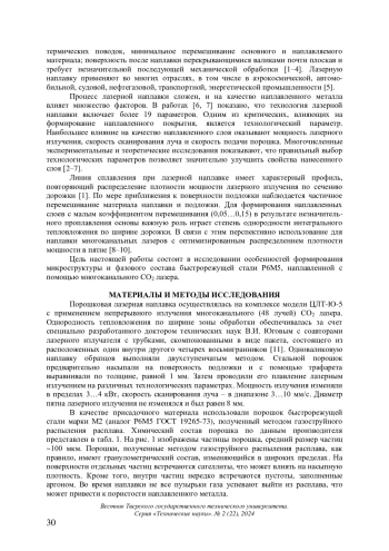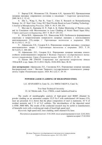 АФАНАСЬЕВА Л. Е., СМОЛЯКОВА И. А. ПОРОШКОВАЯ ЛАЗЕРНАЯ НАПЛАВКА БЫСТРОРЕЖУЩЕЙ СТАЛИ // ВЕСТНИК ТВЕРСКОГО ГОСУДАРСТВЕННОГО ТЕХНИЧЕСКОГО УНИВЕРСИТЕТА. СЕРИЯ: ТЕХНИЧЕСКИЕ НАУКИ. 2024. № 2 (22)