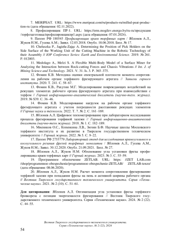 4. Яблонев А.Л., Жуков Н.М. Экспериментальное обоснование угла установки фрезы торфяного бровкореза // Вестник Тверского государственного технического университета. Серия “Технические науки”. 2023. № 2 (18). С. 21-30. EDN: PBQWOE