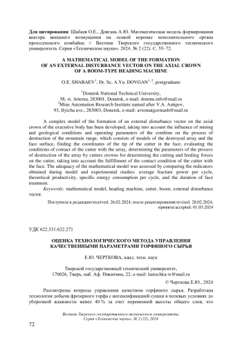 Рассмотрены вопросы управления качеством торфяного сырья. Разработана технология добычи фрезерного торфа с интенсификацией сушки в полевых условиях до уборочной влажности менее 40 % за счет переменной высоты общего слоя, что позволяет управлять качеством добываемого сырья и снизить энергоемкость процесса его переработки. Проведены полевые испытания данной технологии на торфяном месторождении. Определены показатели относительной влажности убираемой торфяной крошки в каждом цикле по двум технологиям. Приведены результаты сравнительного анализа эксплуатационной производительности машин с учетом разных технологических параметров добычи.