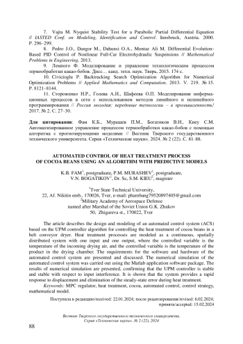 1. Чохонелидзе А.Н., Лемпого Ф., Браун-Аквей В. Математическая модель для процесса термообработки какао-бобов // Вестник евразийской науки. 2014. № 6 (25). С. 126.