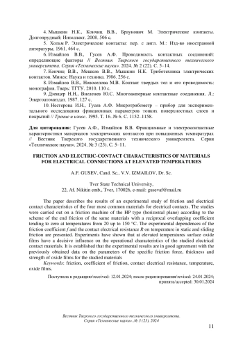 В работе описаны результаты экспериментального исследования фрикционных и электроконтактных характеристик четырех наиболее распространенных материалов для электрических контактов. Исследования проводили на машине трения типа ГП (горизонтальная плоскость) по схеме торцевого трения одноименных материалов с коэффициентом взаимного перекрытия, стремящимся к нулю, при температурах от 20 до 150 оС. Представлены экспериментальные зависимости коэффициента трения f и контактного электрического сопротивления R в статике и при трении скольжения от температуры. Эксперименты показали, что при повышенных температурах определяющее влияние на эксплуатационные характеристики исследованных электроконтактных материалов оказывают поверхностные окисные пленки. Установлено, что результаты экспериментов находятся в хорошем соответствии с полученными ранее данными о параметрах удельной силы трения, толщине и прочности окисных пленок для изученных материалов
