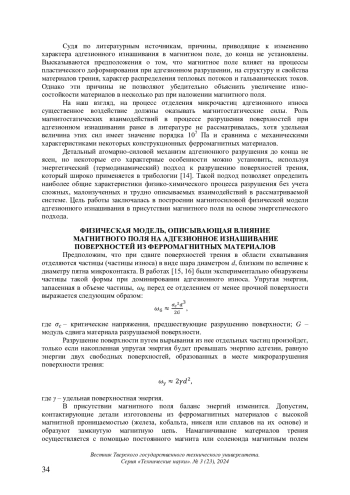 В работе приведена новая модель адгезионного изнашивания поверхностей при наложении магнитного поля. Предложено учитывать магнитостатические силы, действующие в процессе отделения частиц износа. Подчеркнуто, что на качественном уровне модель хорошо согласуется с экспериментальными результатами. Отмечено, что полученные результаты могут быть использованы для прогнозирования свойств трибоузлов, работающих в магнитных полях.