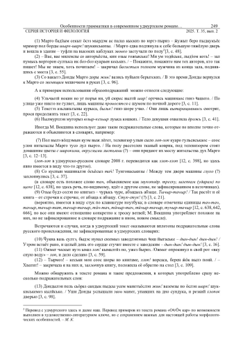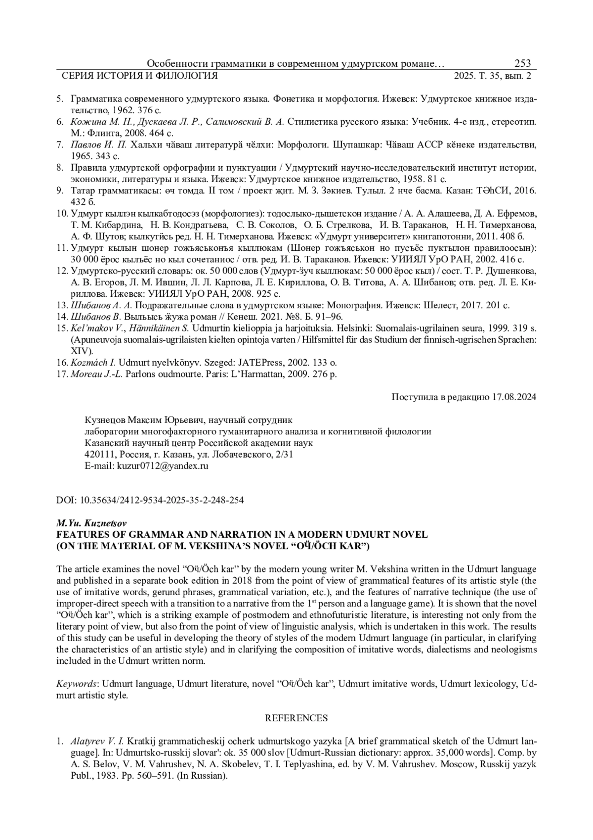 В статье рассматривается роман современной молодой писательницы М. Векшиной «Оӵ/Ӧч кар», написанный на удмуртском языке и выпущенный в свет отдельным книжным изданием в 2018 г., с точки зрения грамматических особенностей его художественного стиля (употребление подражательных слов, деепричастных оборотов, грамматическая вариативность в формах условного наклонения). Показано, что роман «Оӵ/Ӧч кар», являющийся ярким образцом постмодернистской и этнофутуристической литературы, представляет интерес не только с собственно литературоведческой точки зрения, но и с точки зрения лингвистического анализа, который и предпринят в данной работе. Результаты исследования могут быть полезны при разработке теории стилей современного удмуртского языка (в частности, при уточнении характеристик художественного стиля), а также при уточнении состава подражательных слов и рамок грамматической вариативности удмуртской письменной нормы.